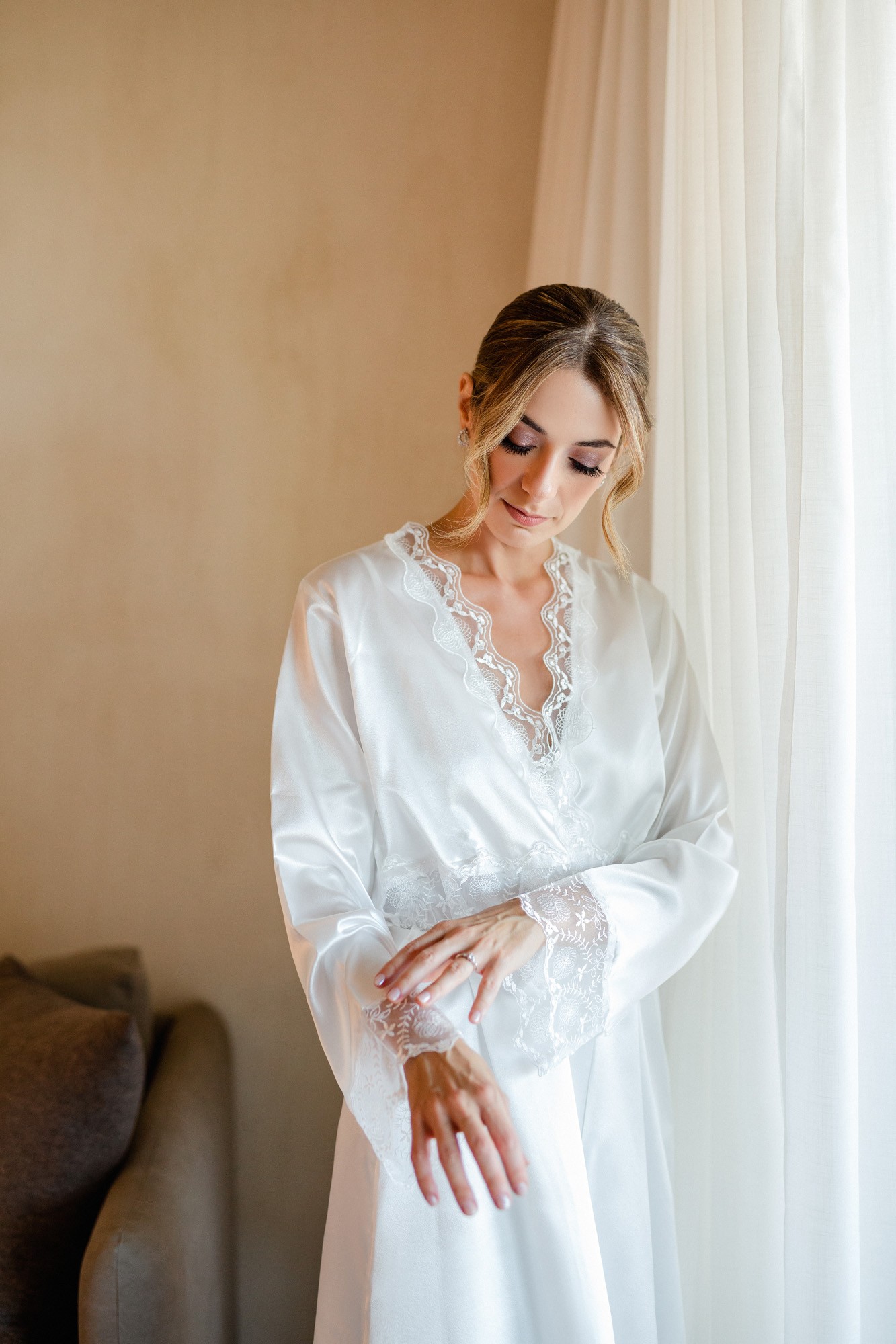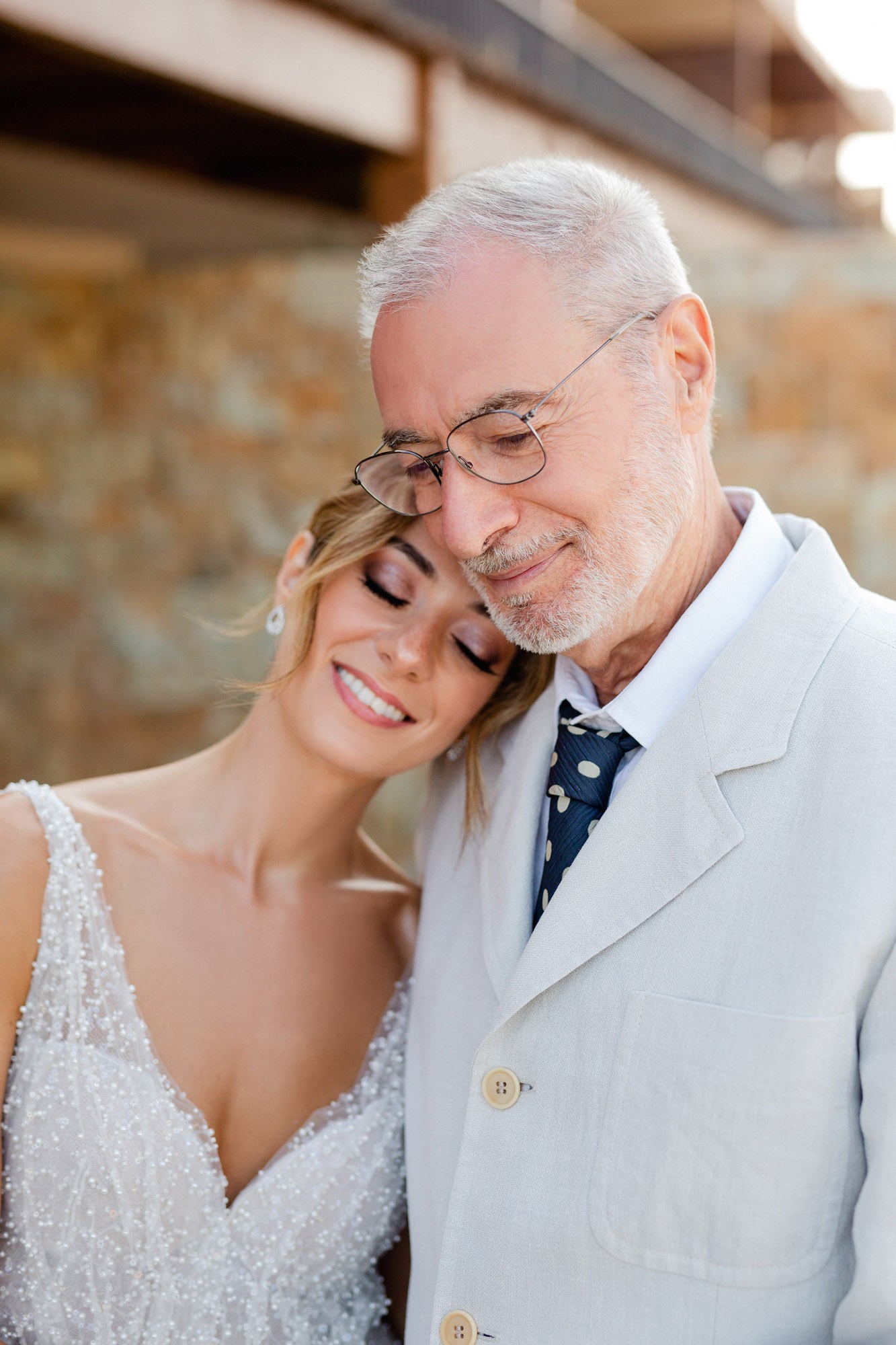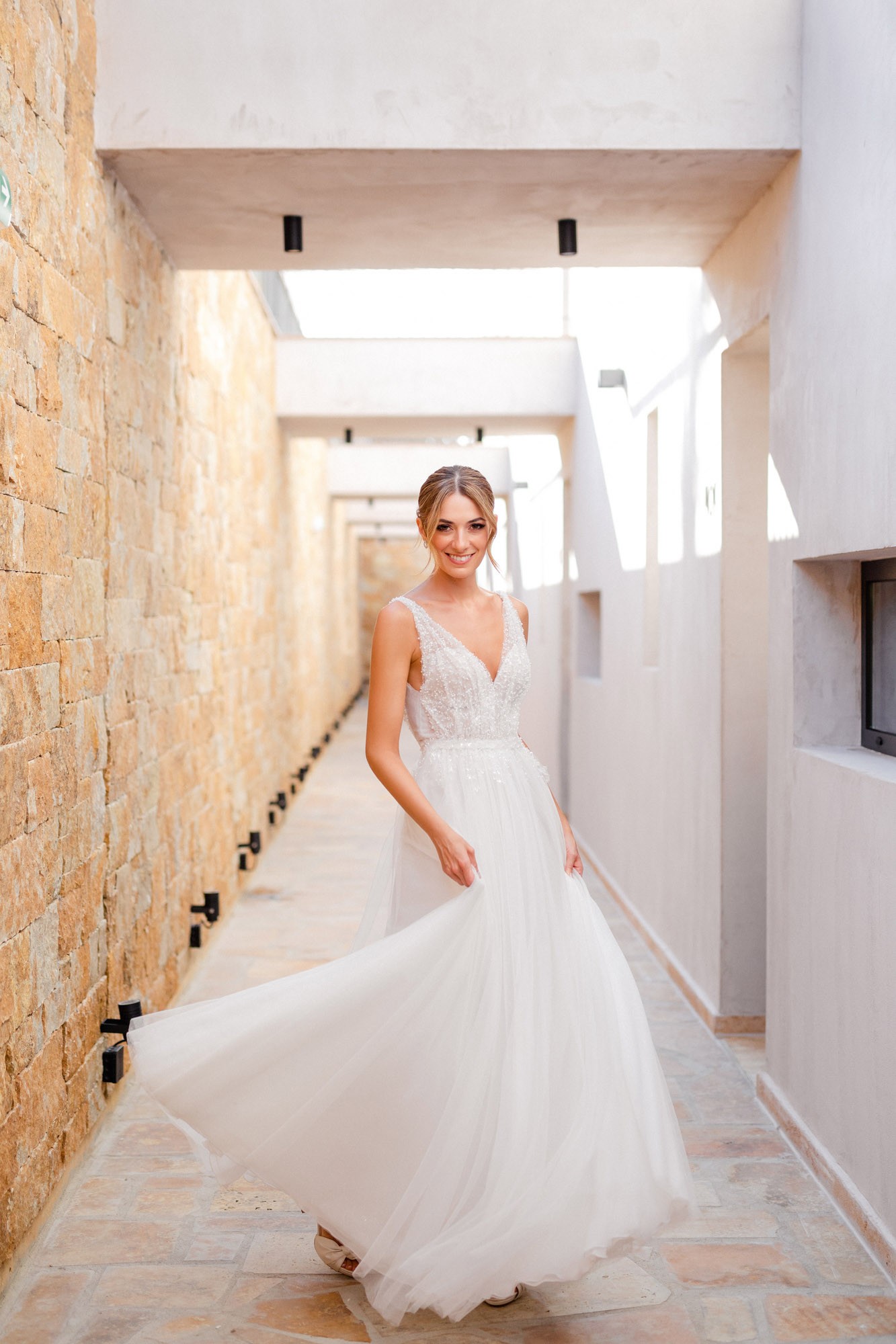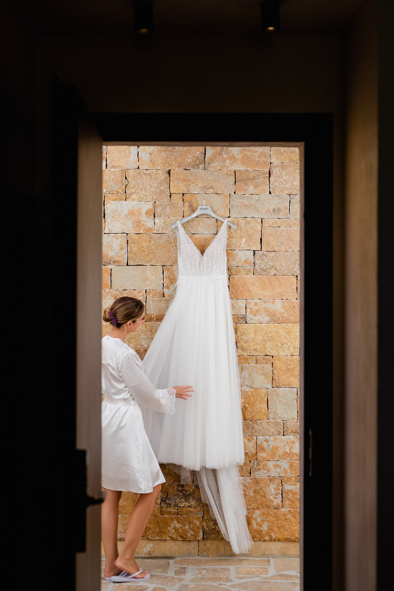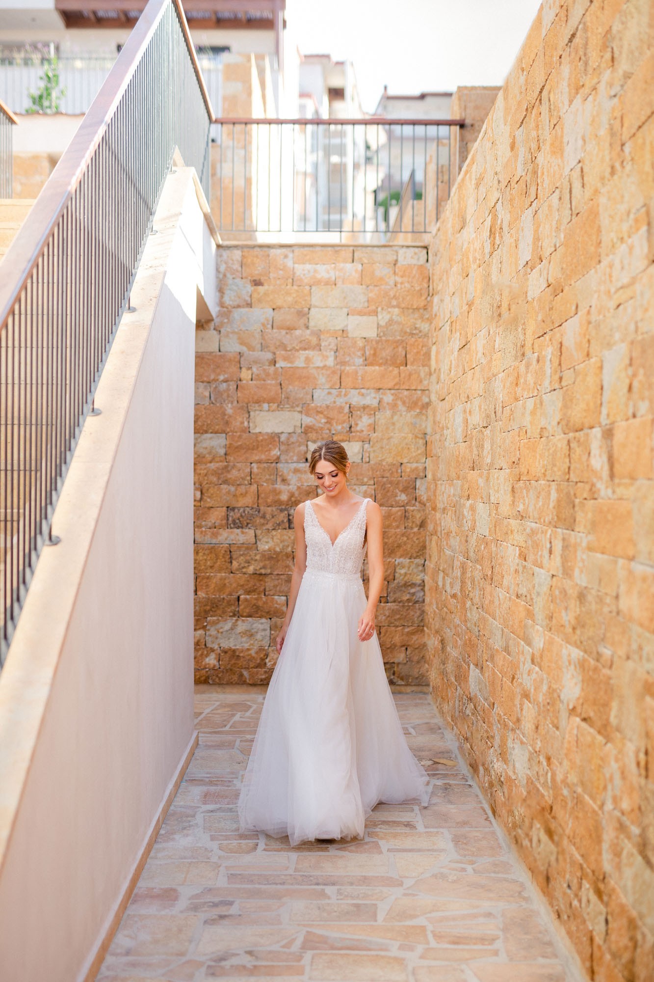 Η Αλίκη προετοιμαζόταν επίσης σε ένα ξεχωριστό χώρο του Pnoes Luxury Suites. Η στιγμή που φόρεσε το νυφικό, μια δημιουργία της Denise Elefteriou, ήταν γεμάτη συγκίνηση και χαρά. Η επιλογή ενός ρομαντικού χτενίσματος και το απαλό μακιγιάζ την έκαναν ακόμα πιο εκθαμβωτική. Ο πατέρας της Αλίκης την αντίκρισε μέσα στο νυφικό της για πρώτη φορά και η συγκίνηση ήταν μεγάλη.