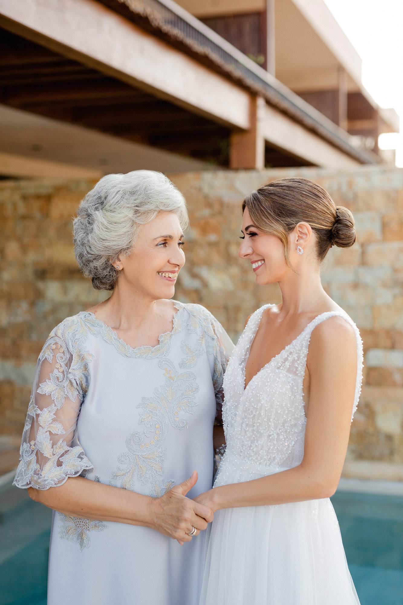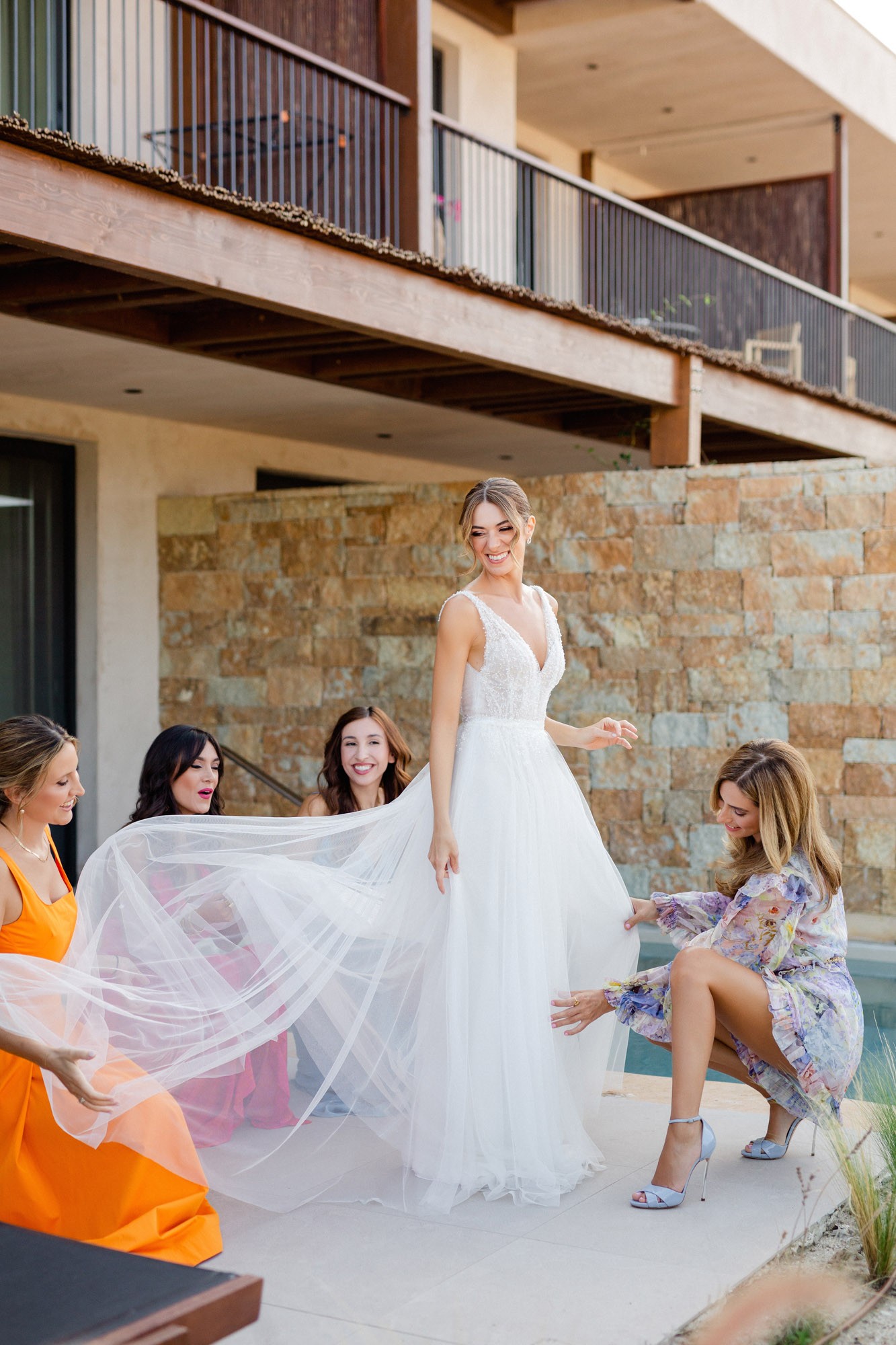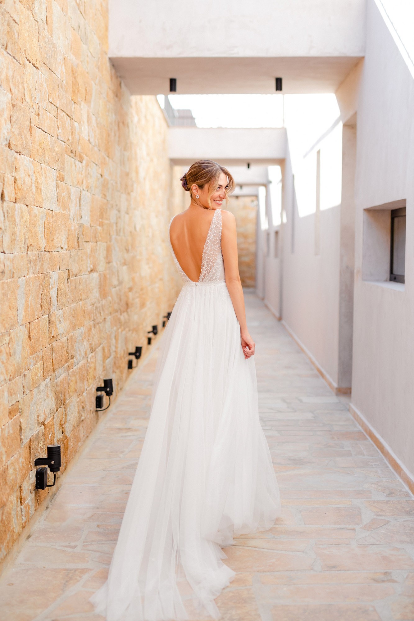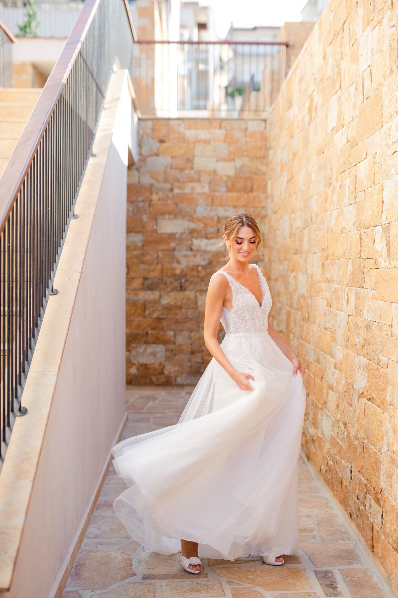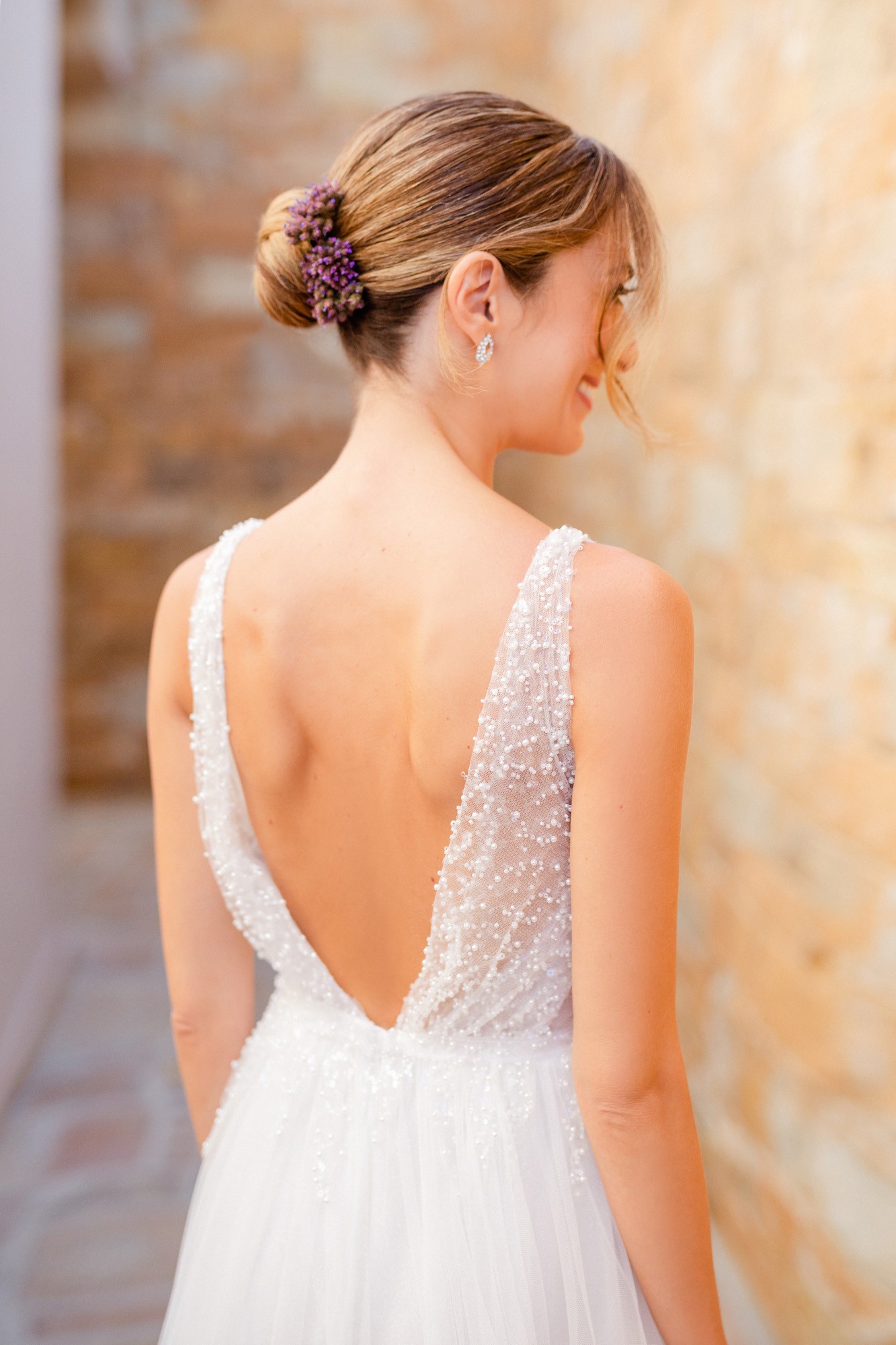 Η Αλίκη προετοιμαζόταν επίσης σε ένα ξεχωριστό χώρο του Pnoes Luxury Suites. Η στιγμή που φόρεσε το νυφικό, μια δημιουργία της Denise Elefteriou, ήταν γεμάτη συγκίνηση και χαρά. Η επιλογή ενός ρομαντικού χτενίσματος και το απαλό μακιγιάζ την έκαναν ακόμα πιο εκθαμβωτική. Ο πατέρας της Αλίκης την αντίκρισε μέσα στο νυφικό της για πρώτη φορά και η συγκίνηση ήταν μεγάλη.