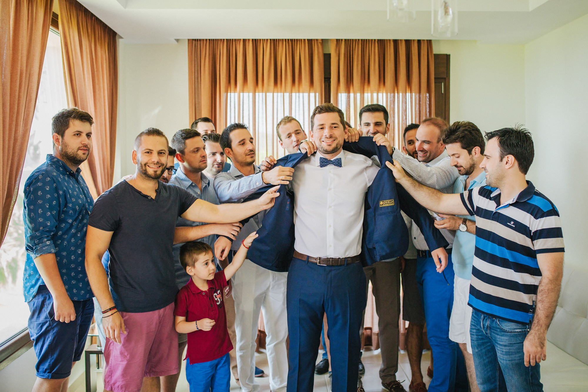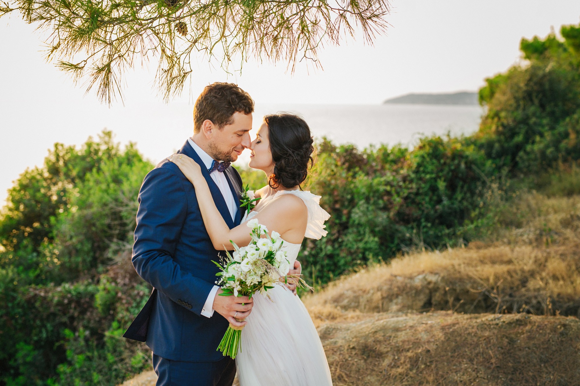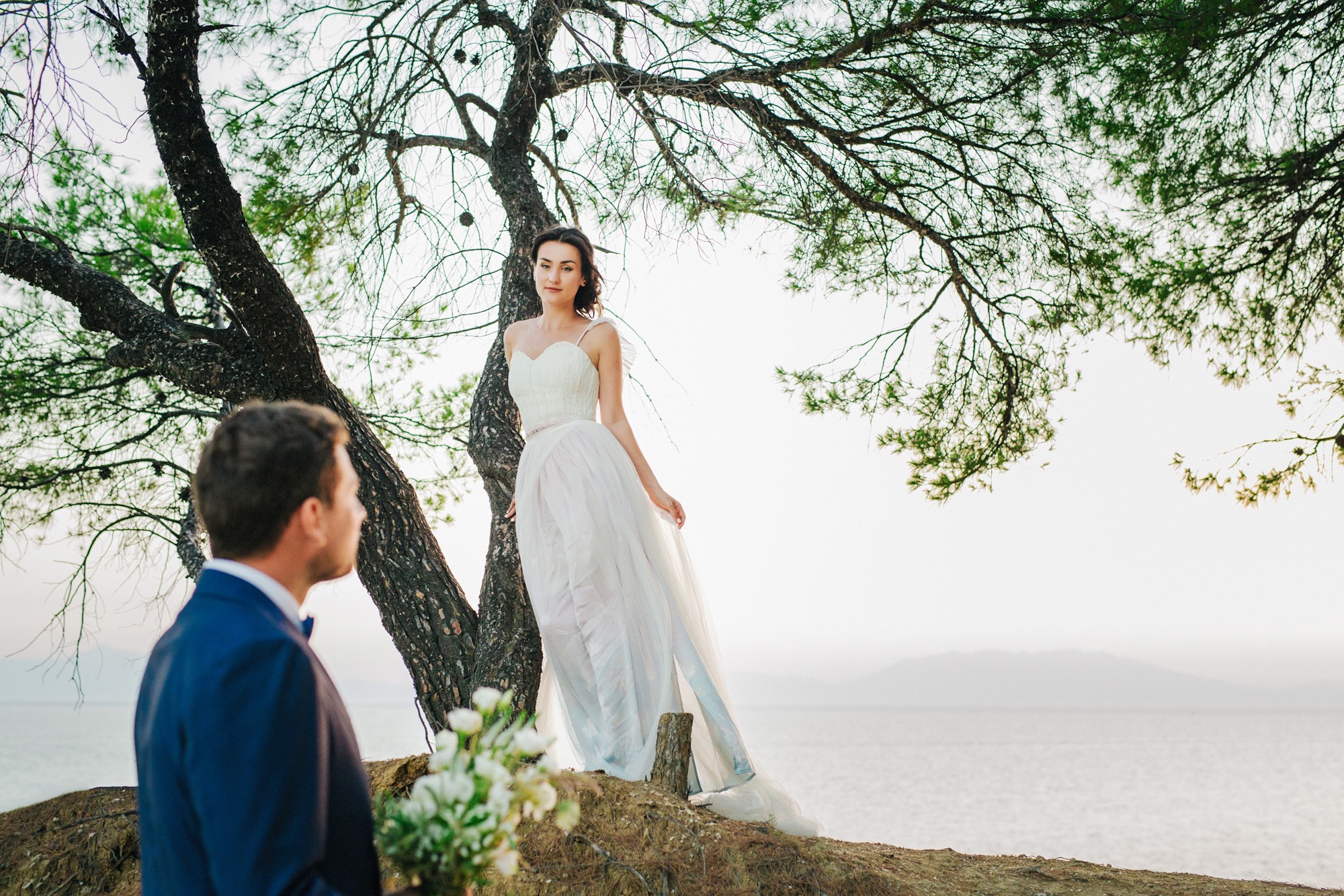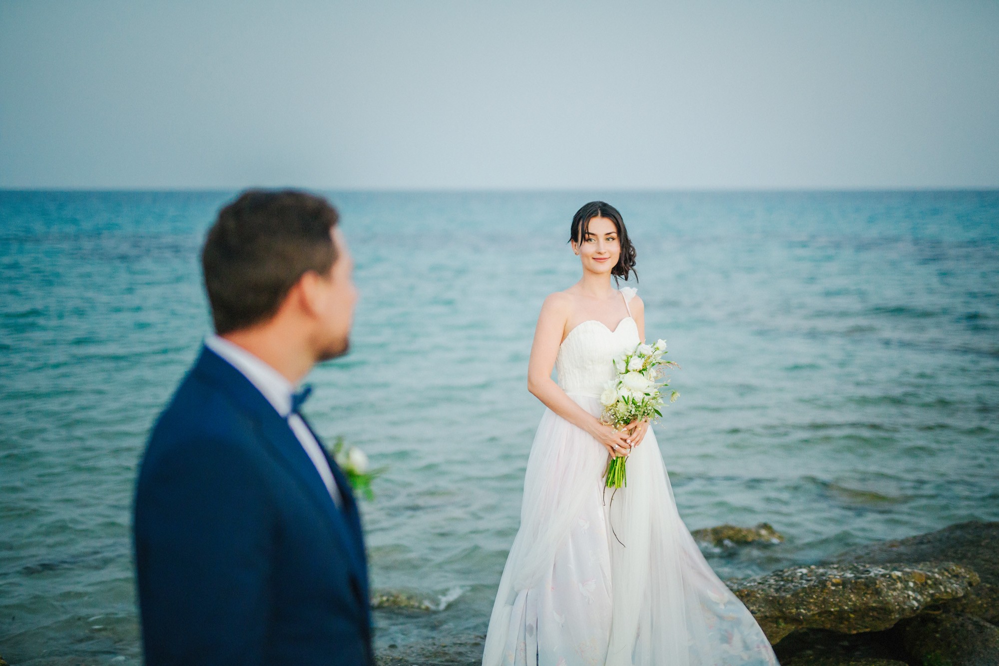 Η μέρα του γάμου ξεκίνησε ακμαία στο Beach Bar Zattero, με χαλάρωση, παιχνίδια και βουτιές στην θάλασσα, κάτω από τον καυτό καλοκαιρινό ήλιο. Πολλοί συγγενείς και φίλοι της Όλγας ταξίδεψαν από την Ρωσία για να την δουν ντυμένη νυφούλα και να την βοηθήσουν στην προετοιμασία της. Η μέλλουσα νύφη, επέλεξε ένα εκπληκτικά ρομαντικό νυφικό, σε απόχρωση λευκού στο πάνω μέρος και ανοιχτού ροζ από την μέση και κάτω, ενώ το σικ αλλά ωστόσο ανάλαφρο νυφικό χτένισμα, ενίσχυσε την εκθαμβωτική παρουσία της. Ο Θέμης επέλεξε από την πλευρά του ένα σκουρόχρωμο μπλε κοστούμι και μπλε παπιγιόν με λευκό πουά που ανέδειξε την elegant πλευρά του, ενώ φρόντισε να τηρήσει με την παρέα του όλα τα γαμπριάτικα έθιμα μέσα σε κλίμα γιορτινό και εύθυμο.