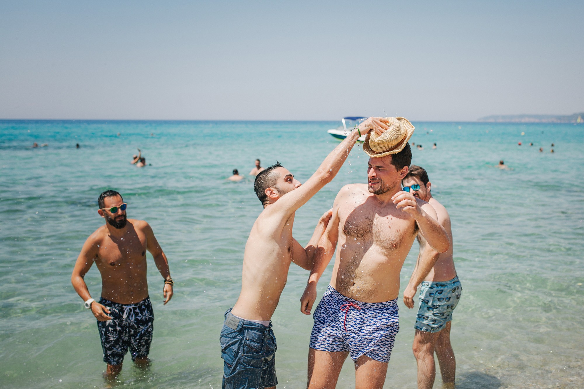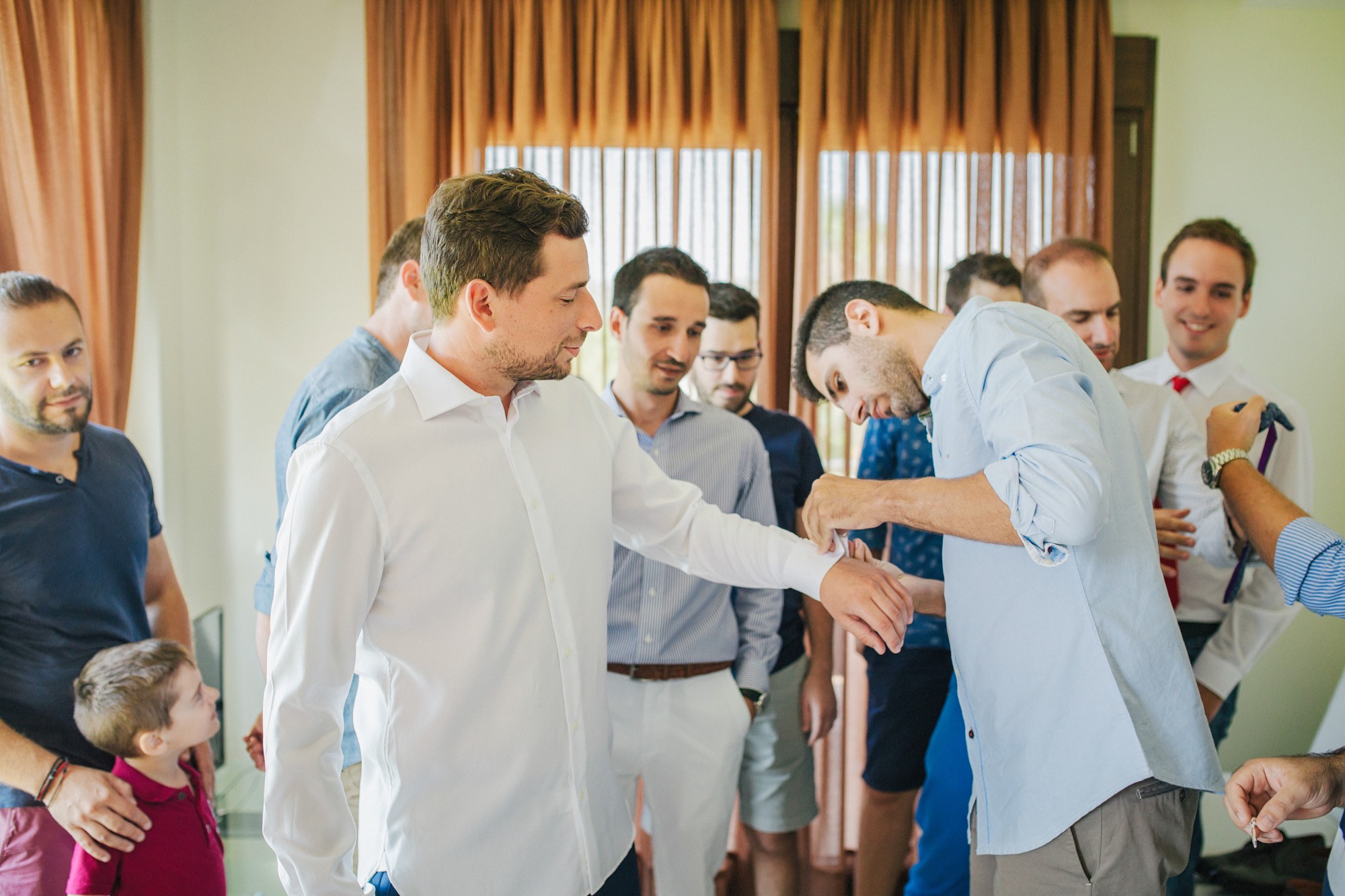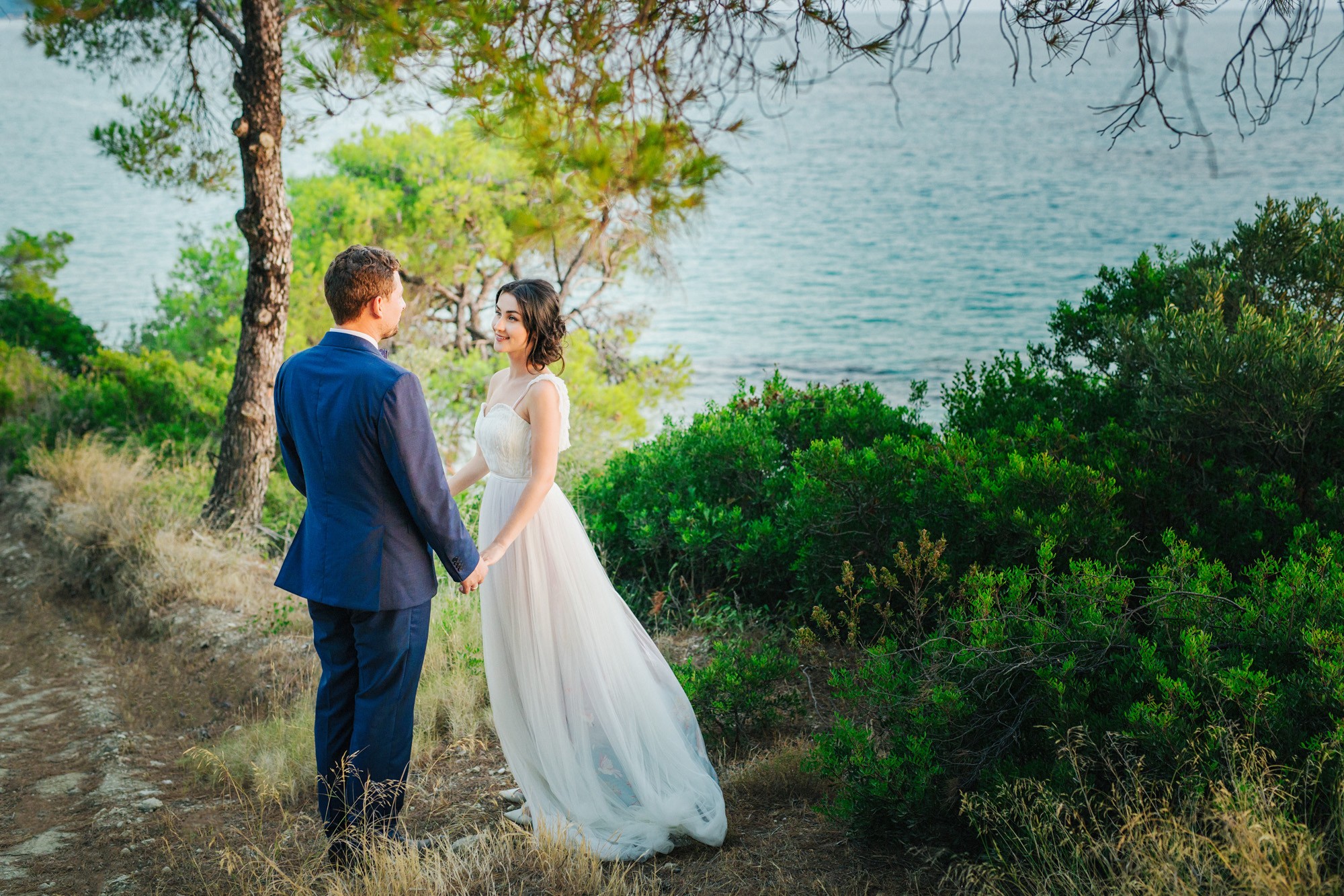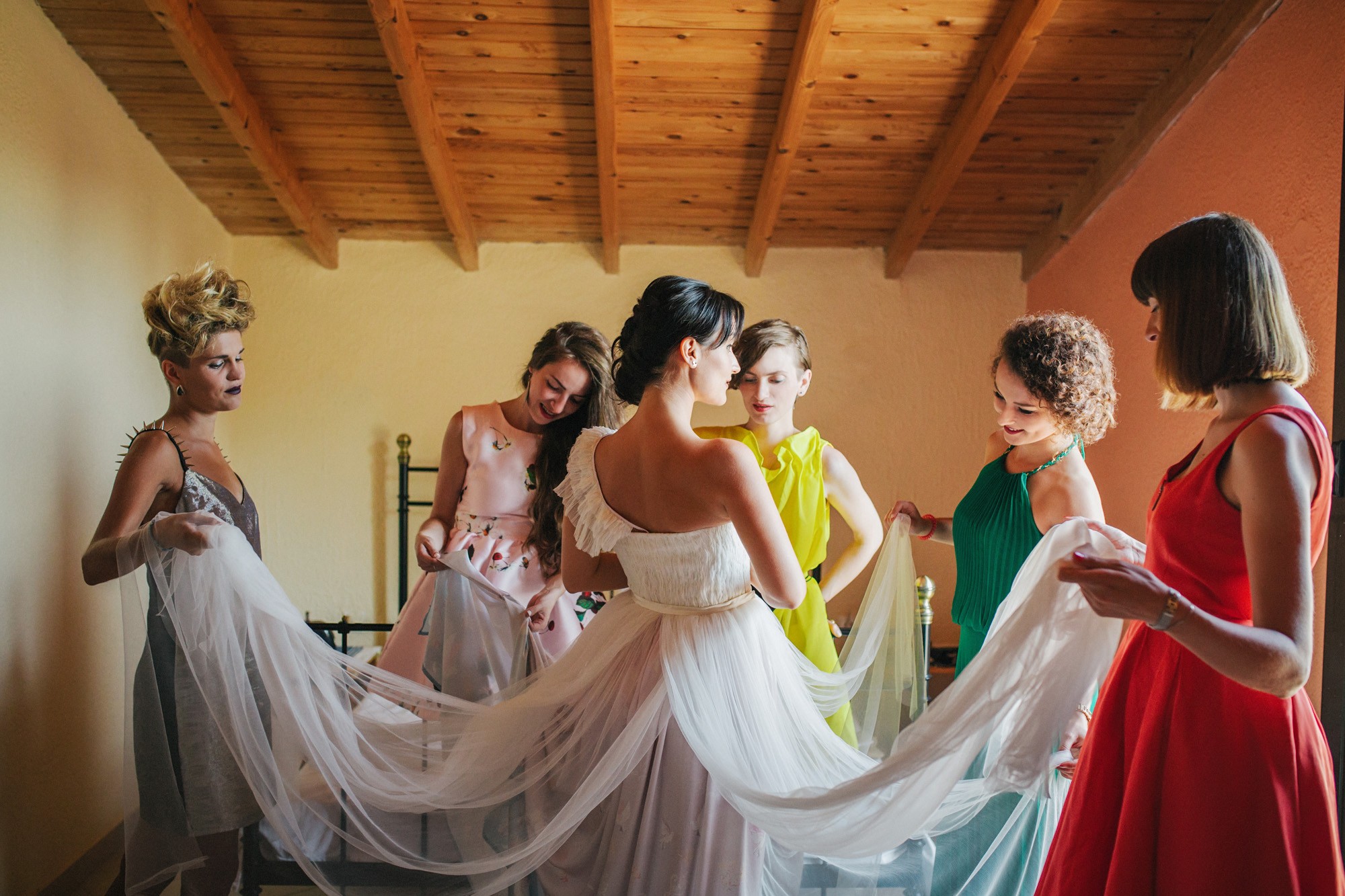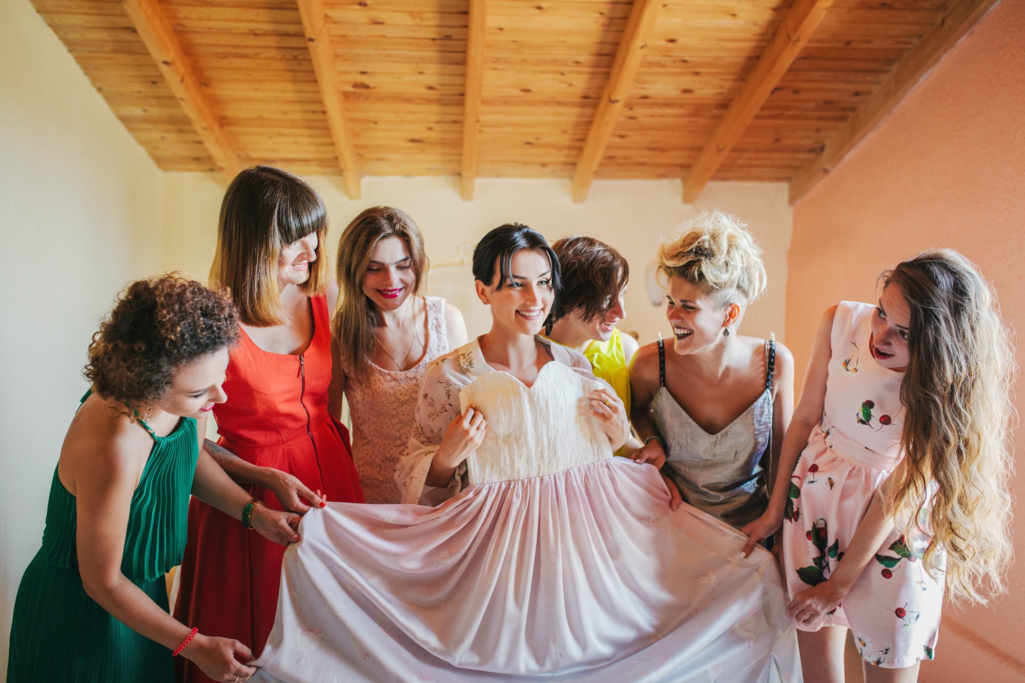 Η μέρα του γάμου ξεκίνησε ακμαία στο Beach Bar Zattero, με χαλάρωση, παιχνίδια και βουτιές στην θάλασσα, κάτω από τον καυτό καλοκαιρινό ήλιο. Πολλοί συγγενείς και φίλοι της Όλγας ταξίδεψαν από την Ρωσία για να την δουν ντυμένη νυφούλα και να την βοηθήσουν στην προετοιμασία της. Η μέλλουσα νύφη, επέλεξε ένα εκπληκτικά ρομαντικό νυφικό, σε απόχρωση λευκού στο πάνω μέρος και ανοιχτού ροζ από την μέση και κάτω, ενώ το σικ αλλά ωστόσο ανάλαφρο νυφικό χτένισμα, ενίσχυσε την εκθαμβωτική παρουσία της. Ο Θέμης επέλεξε από την πλευρά του ένα σκουρόχρωμο μπλε κοστούμι και μπλε παπιγιόν με λευκό πουά που ανέδειξε την elegant πλευρά του, ενώ φρόντισε να τηρήσει με την παρέα του όλα τα γαμπριάτικα έθιμα μέσα σε κλίμα γιορτινό και εύθυμο.