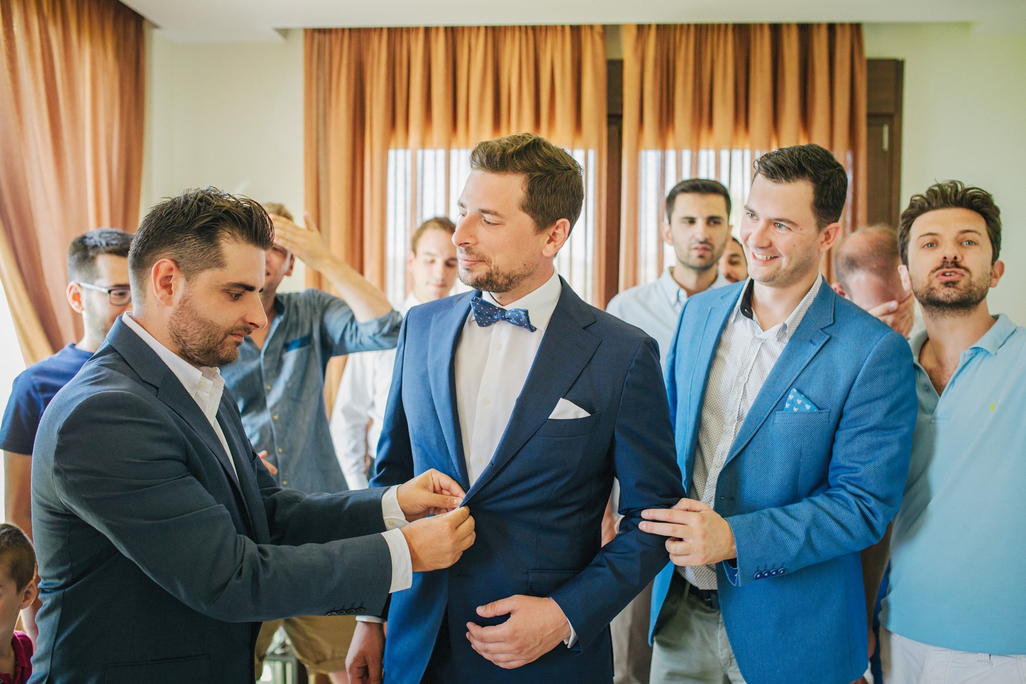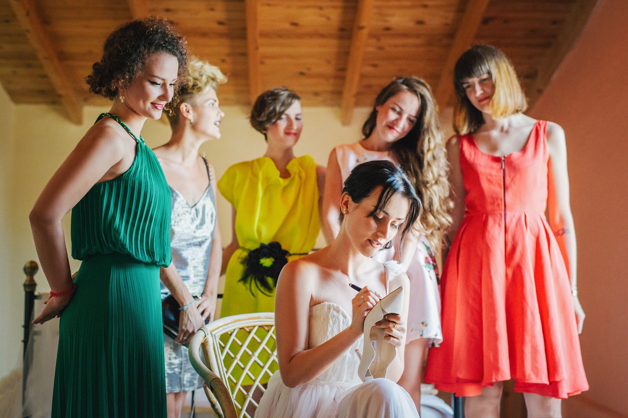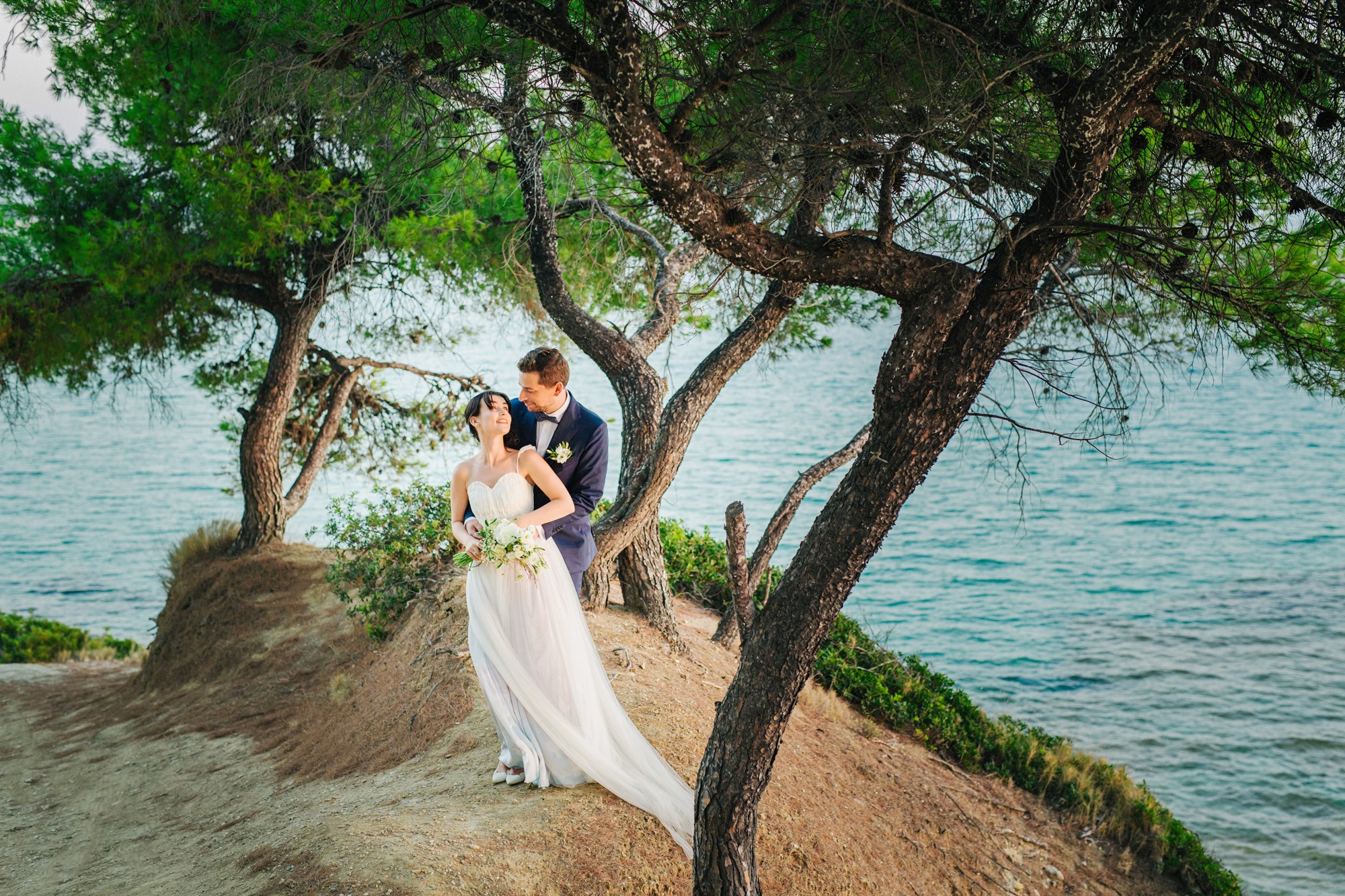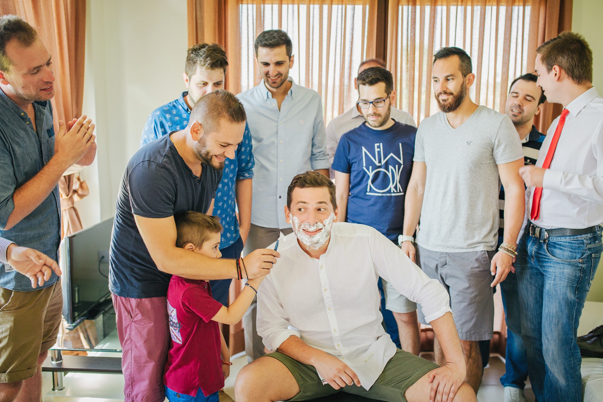 Η μέρα του γάμου ξεκίνησε ακμαία στο Beach Bar Zattero, με χαλάρωση, παιχνίδια και βουτιές στην θάλασσα, κάτω από τον καυτό καλοκαιρινό ήλιο. Πολλοί συγγενείς και φίλοι της Όλγας ταξίδεψαν από την Ρωσία για να την δουν ντυμένη νυφούλα και να την βοηθήσουν στην προετοιμασία της. Η μέλλουσα νύφη, επέλεξε ένα εκπληκτικά ρομαντικό νυφικό, σε απόχρωση λευκού στο πάνω μέρος και ανοιχτού ροζ από την μέση και κάτω, ενώ το σικ αλλά ωστόσο ανάλαφρο νυφικό χτένισμα, ενίσχυσε την εκθαμβωτική παρουσία της. Ο Θέμης επέλεξε από την πλευρά του ένα σκουρόχρωμο μπλε κοστούμι και μπλε παπιγιόν με λευκό πουά που ανέδειξε την elegant πλευρά του, ενώ φρόντισε να τηρήσει με την παρέα του όλα τα γαμπριάτικα έθιμα μέσα σε κλίμα γιορτινό και εύθυμο.