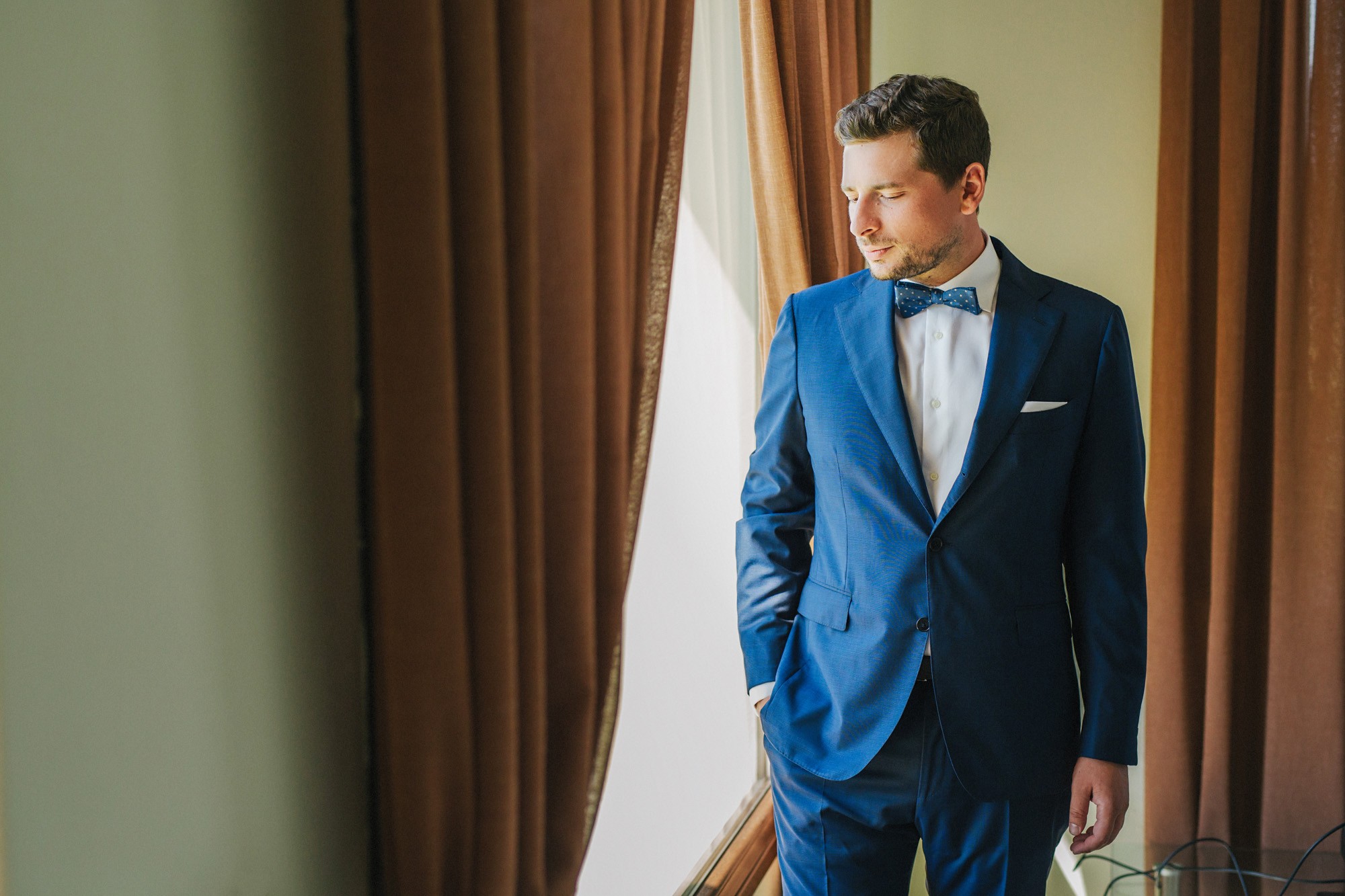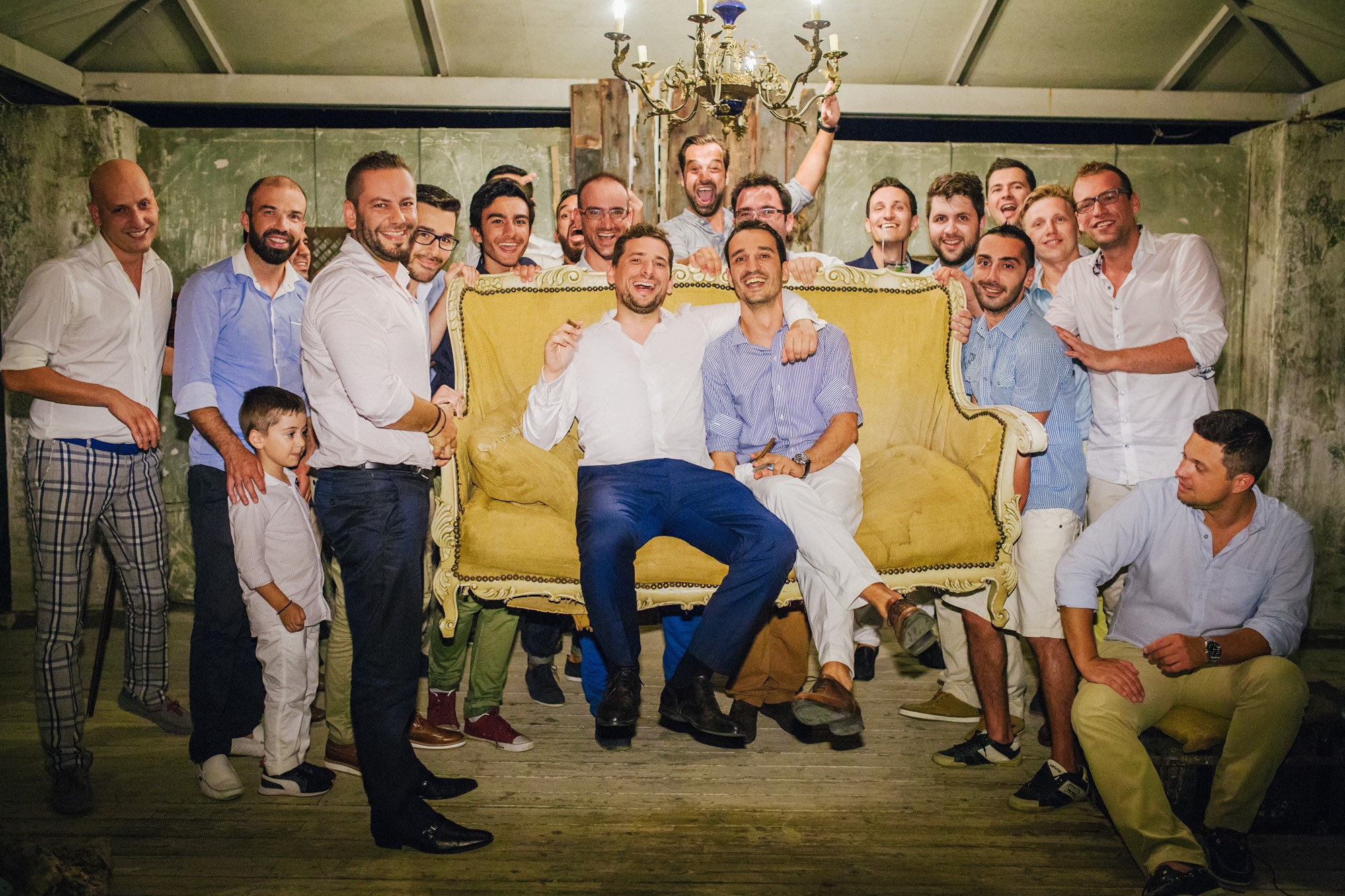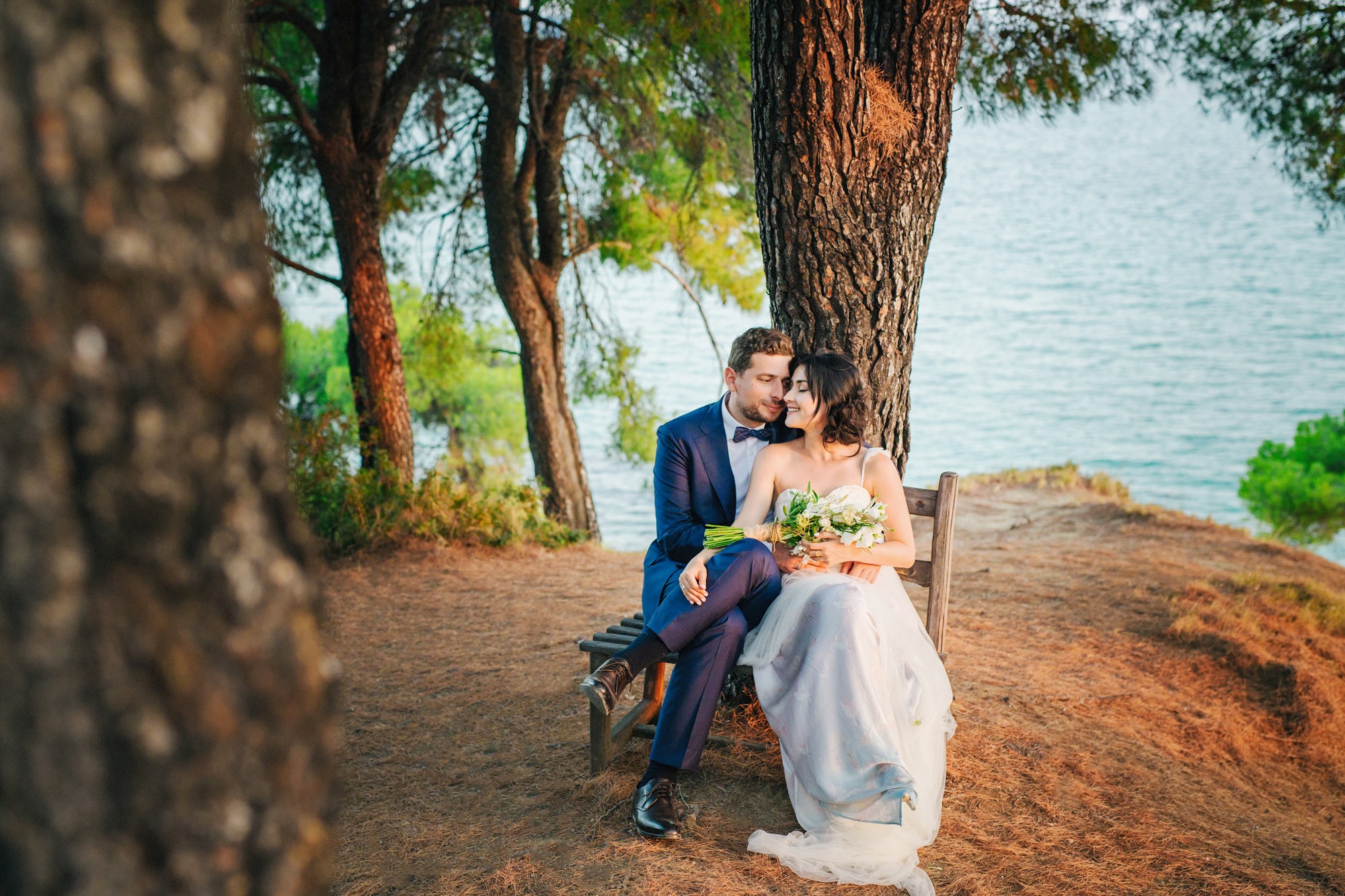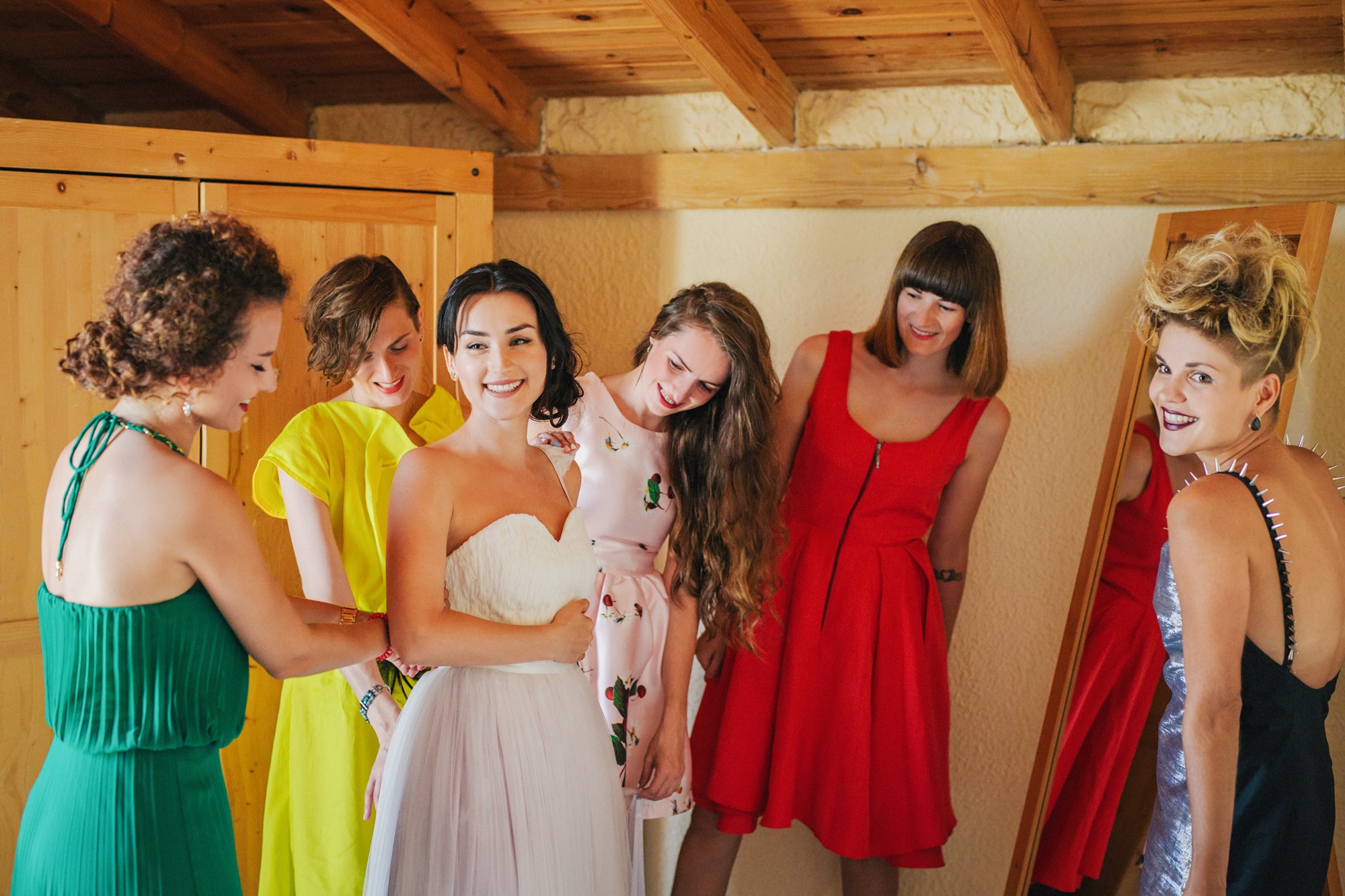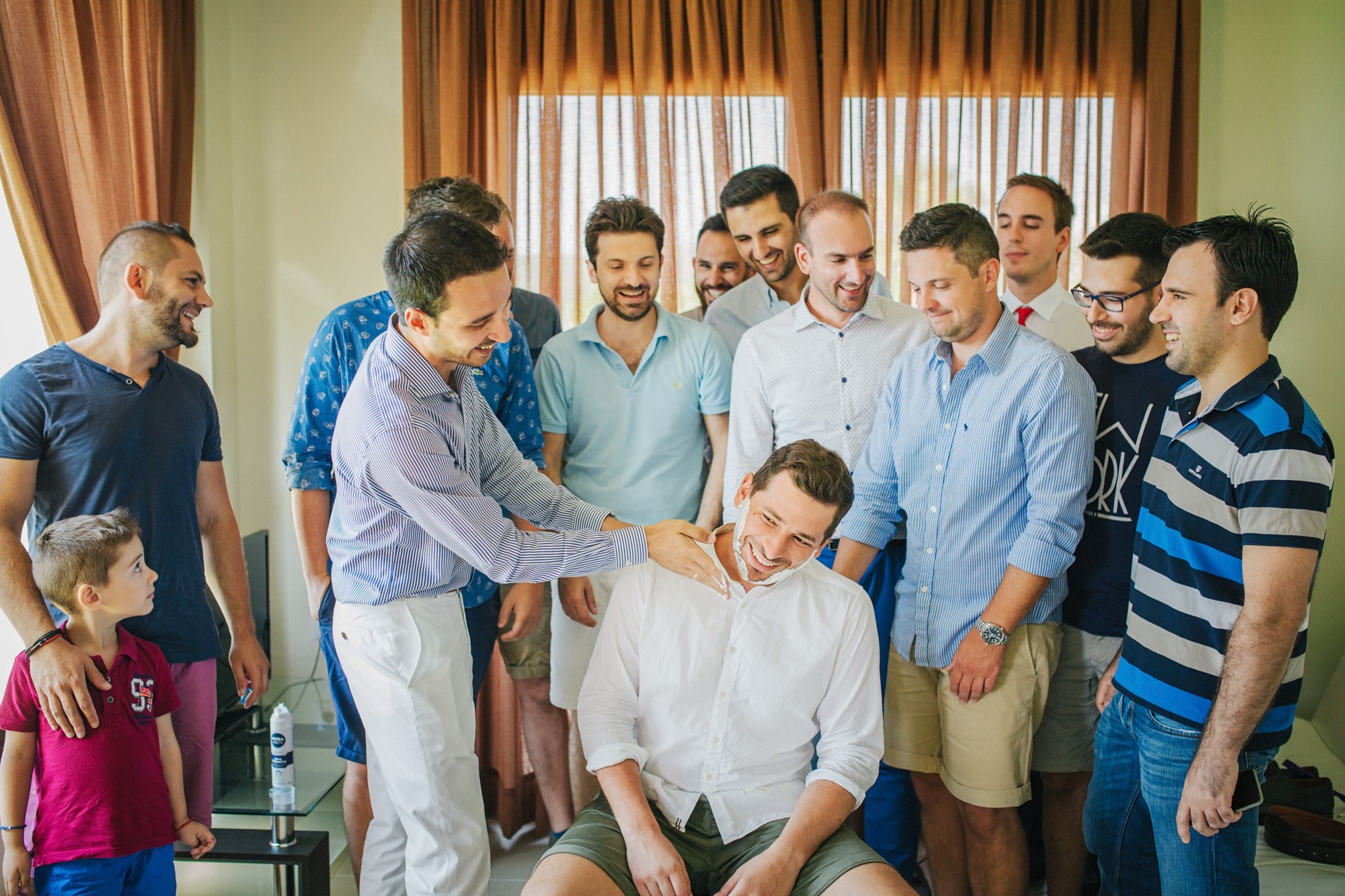 Η μέρα του γάμου ξεκίνησε ακμαία στο Beach Bar Zattero, με χαλάρωση, παιχνίδια και βουτιές στην θάλασσα, κάτω από τον καυτό καλοκαιρινό ήλιο. Πολλοί συγγενείς και φίλοι της Όλγας ταξίδεψαν από την Ρωσία για να την δουν ντυμένη νυφούλα και να την βοηθήσουν στην προετοιμασία της. Η μέλλουσα νύφη, επέλεξε ένα εκπληκτικά ρομαντικό νυφικό, σε απόχρωση λευκού στο πάνω μέρος και ανοιχτού ροζ από την μέση και κάτω, ενώ το σικ αλλά ωστόσο ανάλαφρο νυφικό χτένισμα, ενίσχυσε την εκθαμβωτική παρουσία της. Ο Θέμης επέλεξε από την πλευρά του ένα σκουρόχρωμο μπλε κοστούμι και μπλε παπιγιόν με λευκό πουά που ανέδειξε την elegant πλευρά του, ενώ φρόντισε να τηρήσει με την παρέα του όλα τα γαμπριάτικα έθιμα μέσα σε κλίμα γιορτινό και εύθυμο.