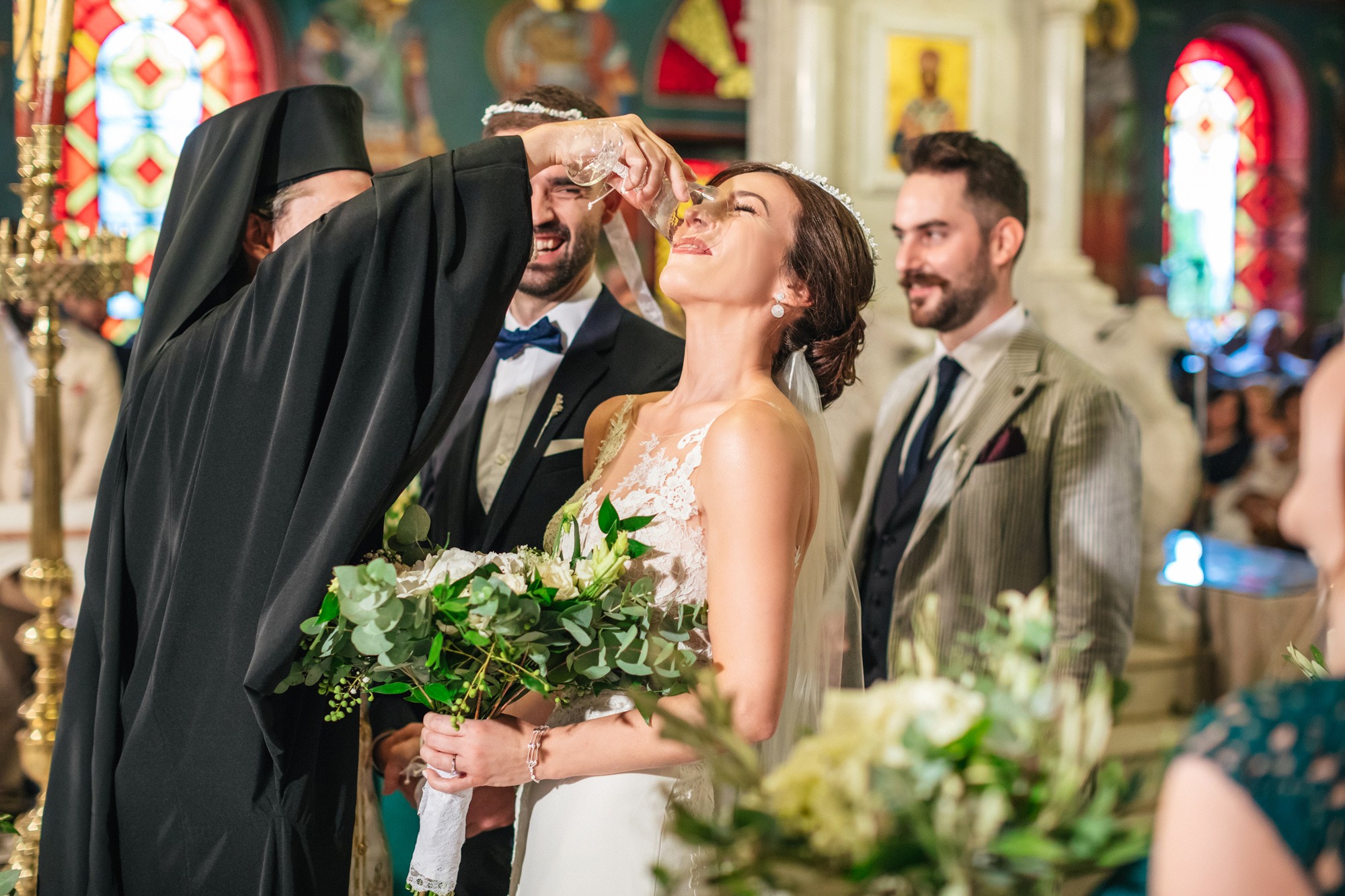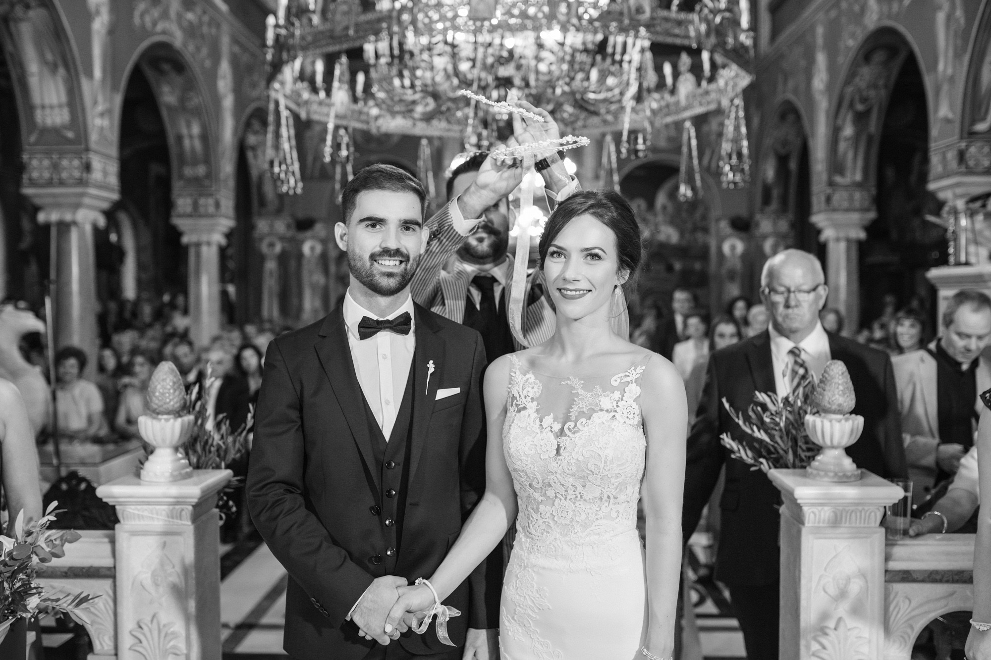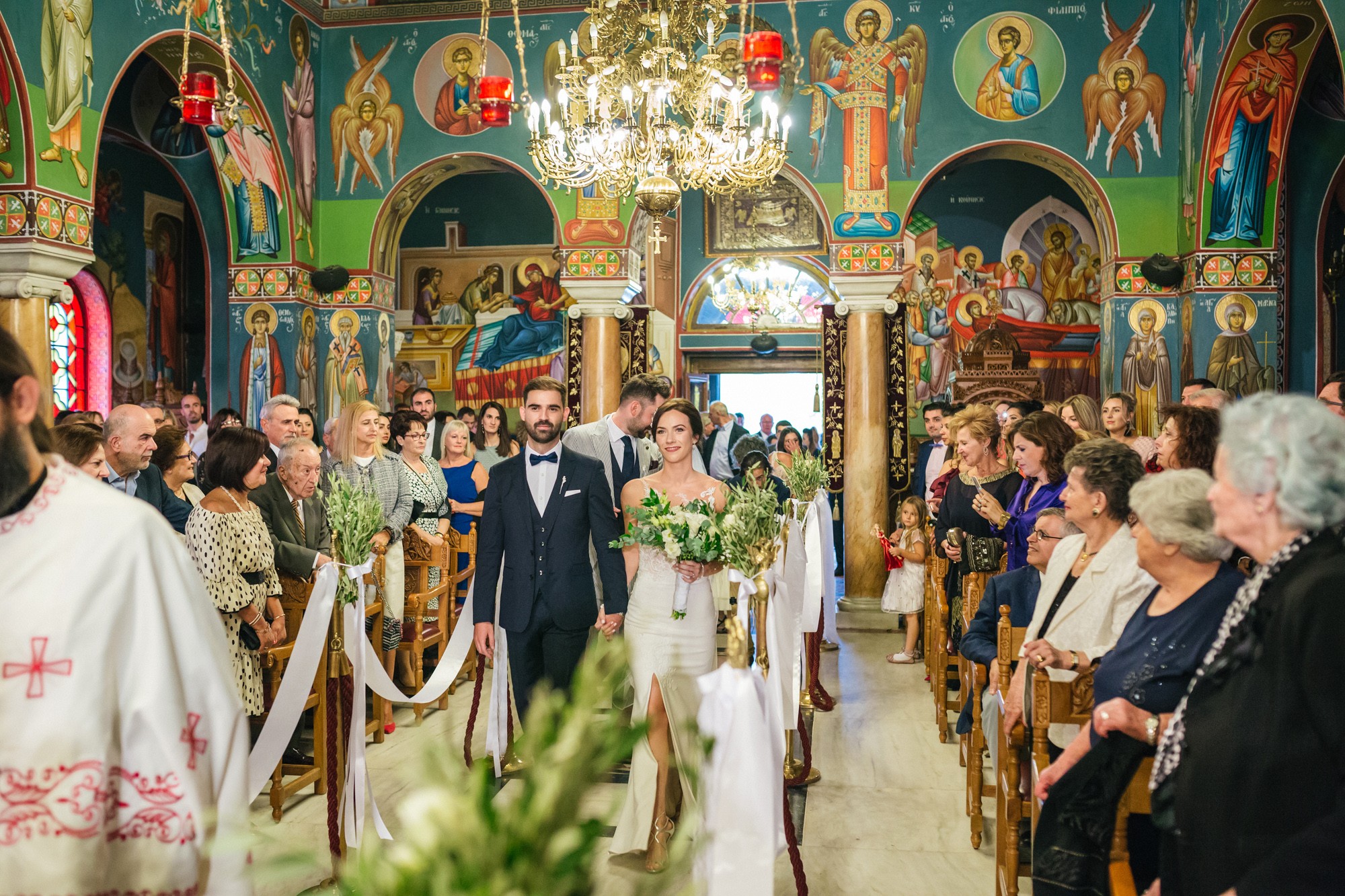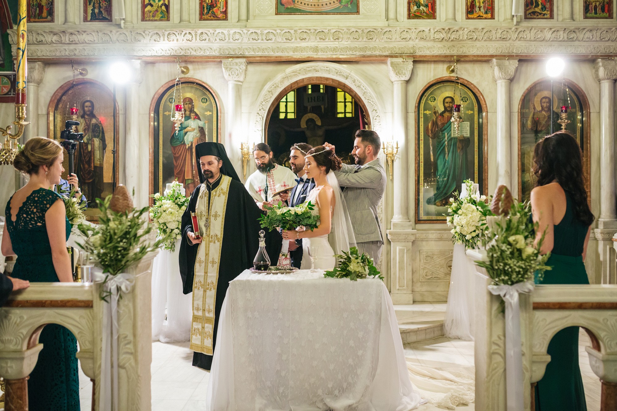 Παραδοσιακή, ζωντανή μουσική συνόδευσε τον γαμπρό στην εκκλησία. Θέαμα που ξεσήκωσε τους καλεσμένους χαρίζοντάς τους μεγάλα χαμόγελα. Οι φωτογραφίες του γάμου απέκτησαν το βαθύτερο νόημά τους με την συνάντηση του γαμπρού και της νύφης μπροστά από την πόρτα της εκκλησίας. Το μυστήριο ξεκίνησε και κύλησε με πολύ έντονο το στοιχείο του ρομαντισμού, το οποίο έγινε ακόμη εντονότερο όταν με την λήξη της τελετής, ο Μιχάλης και η Jane αντάλλαξαν όρκους ενώπιων του πάτερ και των καλεσμένων. Ήταν μια μοναδική στιγμή για τους δυο τους και αυτό φαίνεται έντονα στις φωτογραφίες του γάμου.