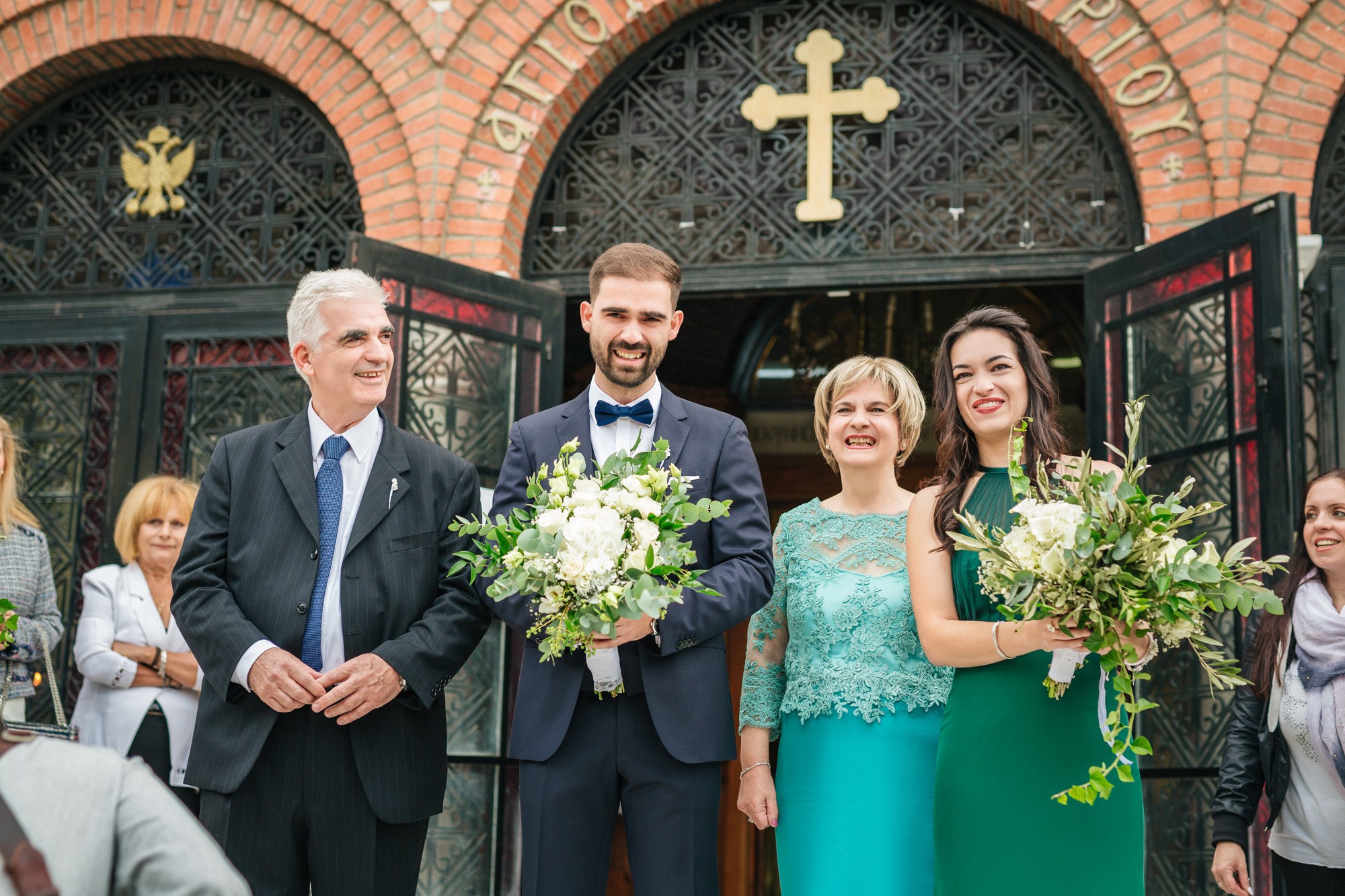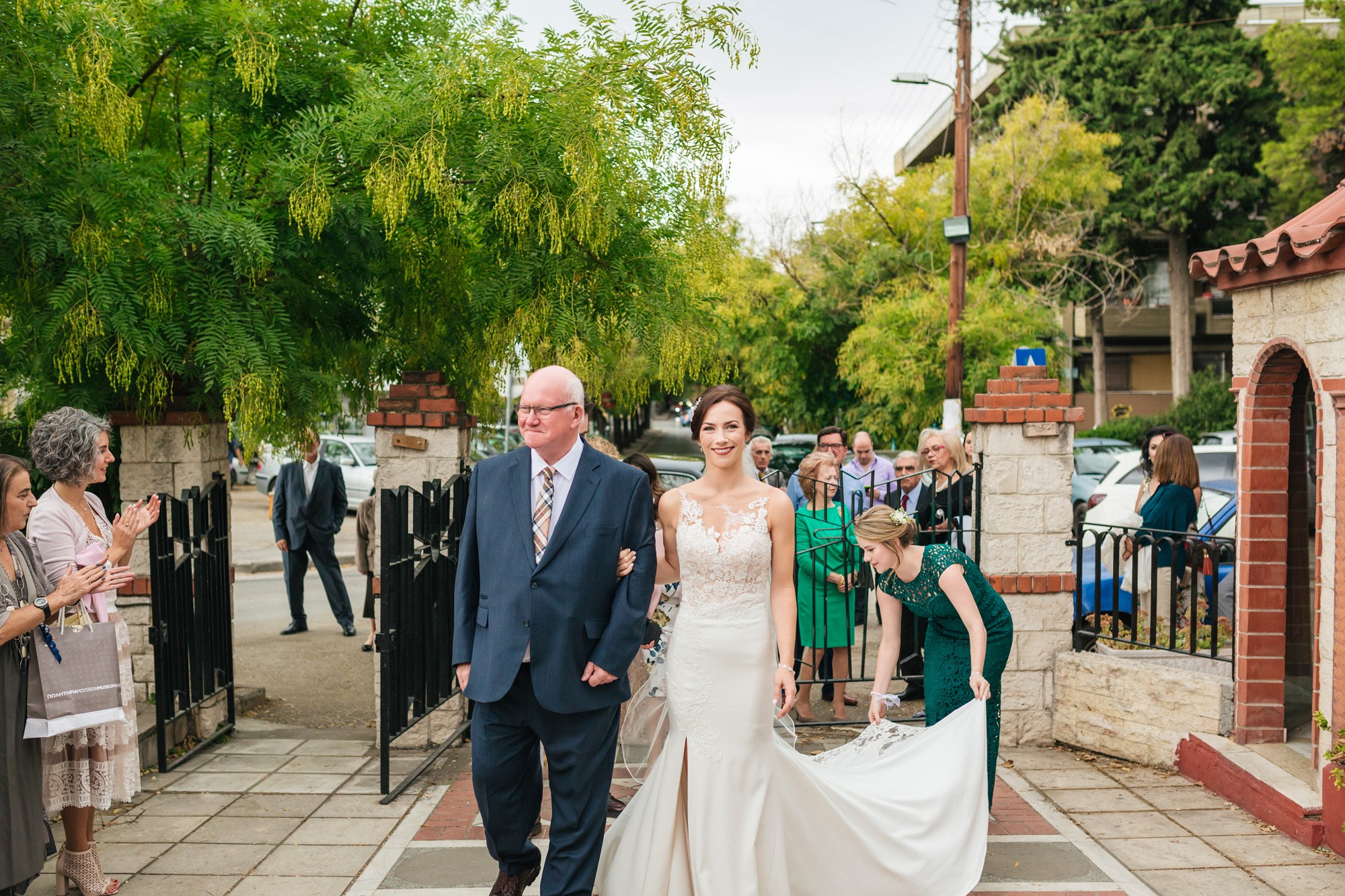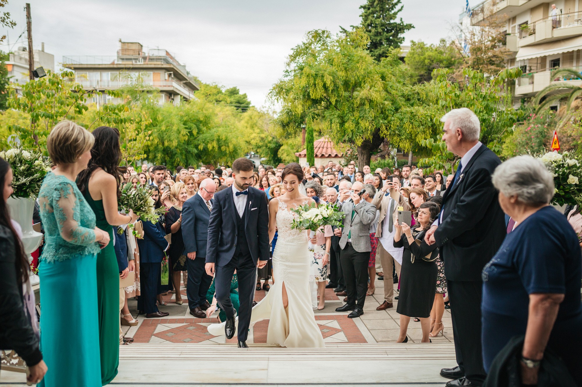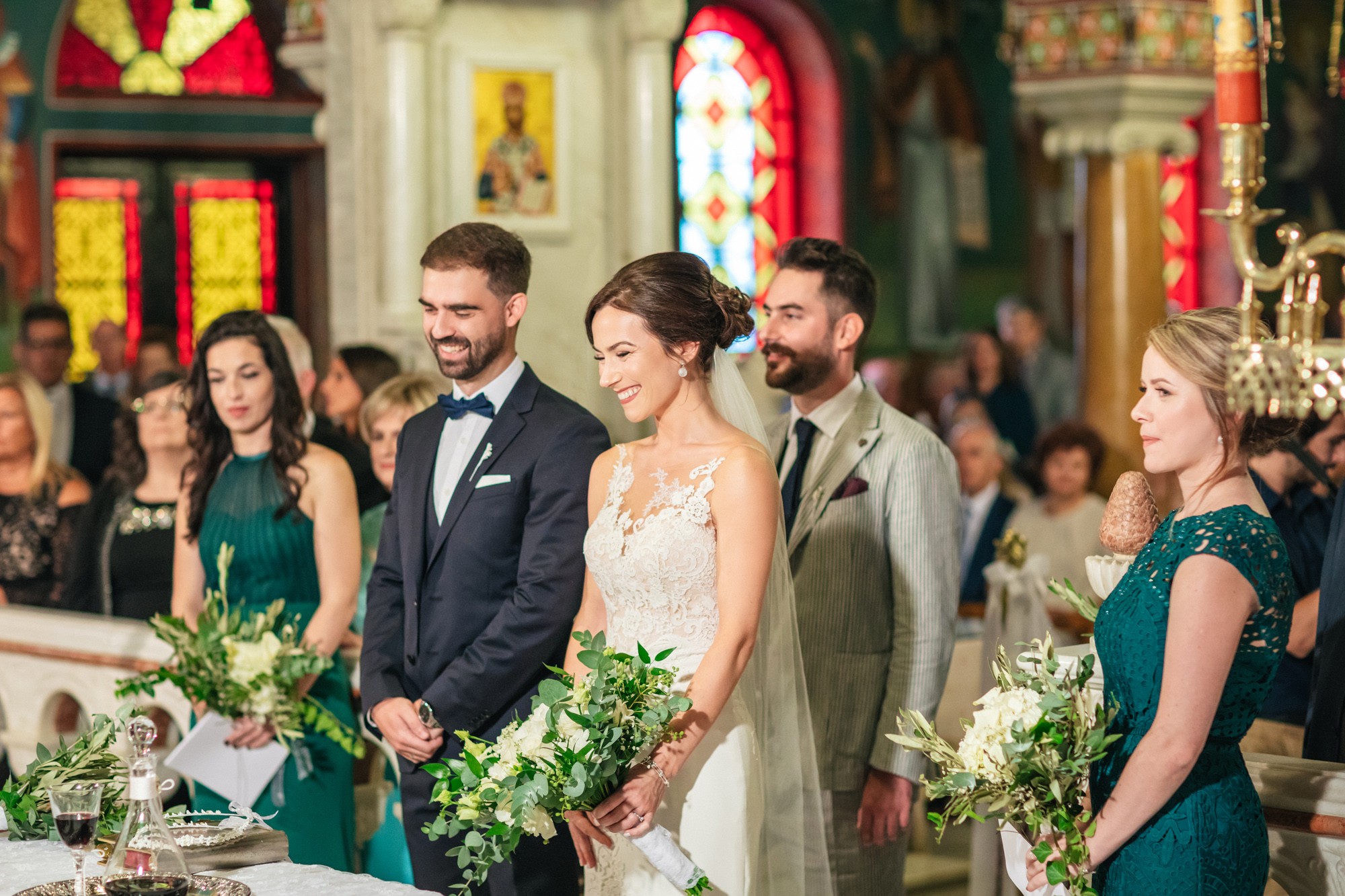 Παραδοσιακή, ζωντανή μουσική συνόδευσε τον γαμπρό στην εκκλησία. Θέαμα που ξεσήκωσε τους καλεσμένους χαρίζοντάς τους μεγάλα χαμόγελα. Οι φωτογραφίες του γάμου απέκτησαν το βαθύτερο νόημά τους με την συνάντηση του γαμπρού και της νύφης μπροστά από την πόρτα της εκκλησίας. Το μυστήριο ξεκίνησε και κύλησε με πολύ έντονο το στοιχείο του ρομαντισμού, το οποίο έγινε ακόμη εντονότερο όταν με την λήξη της τελετής, ο Μιχάλης και η Jane αντάλλαξαν όρκους ενώπιων του πάτερ και των καλεσμένων. Ήταν μια μοναδική στιγμή για τους δυο τους και αυτό φαίνεται έντονα στις φωτογραφίες του γάμου.