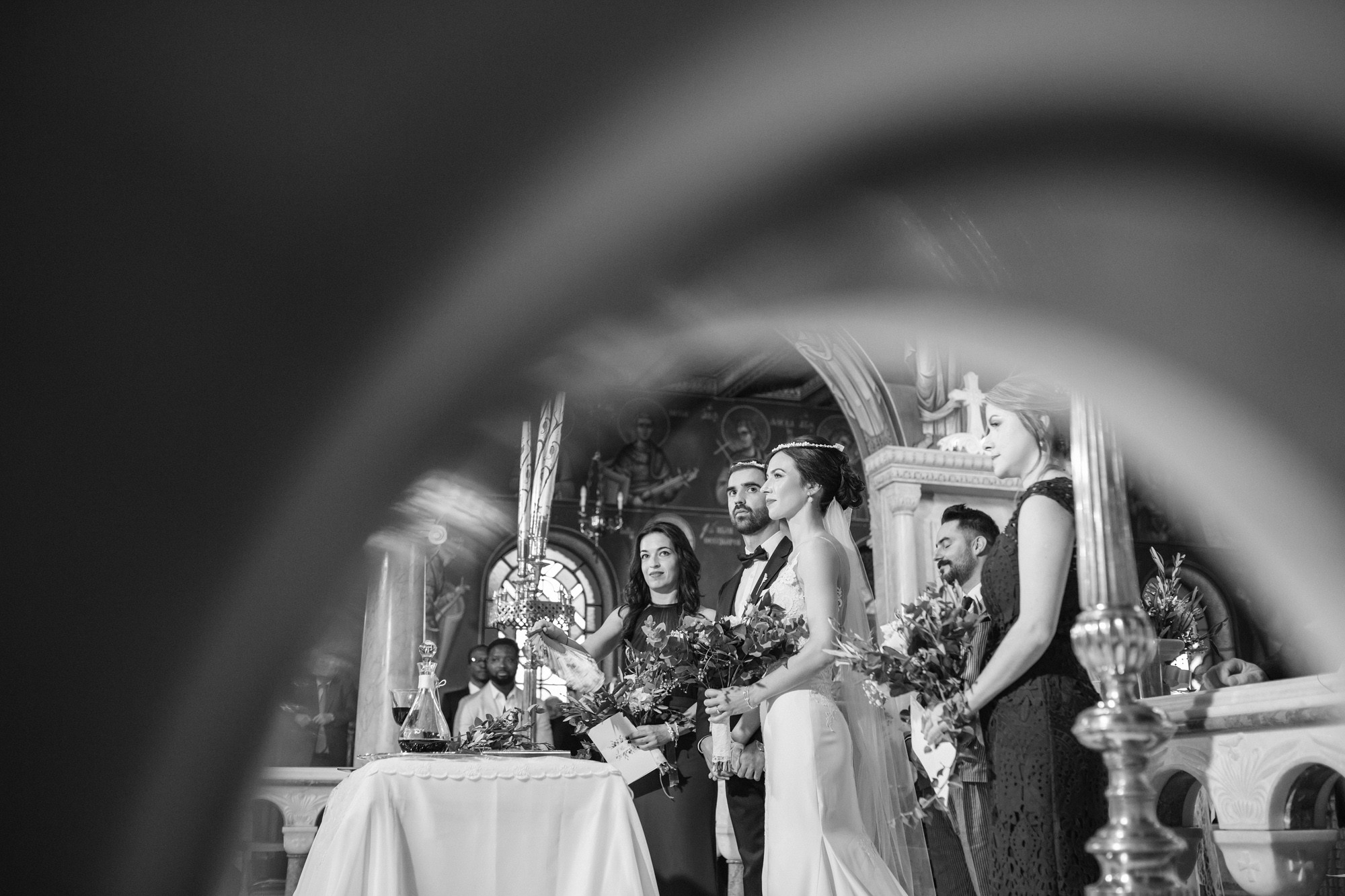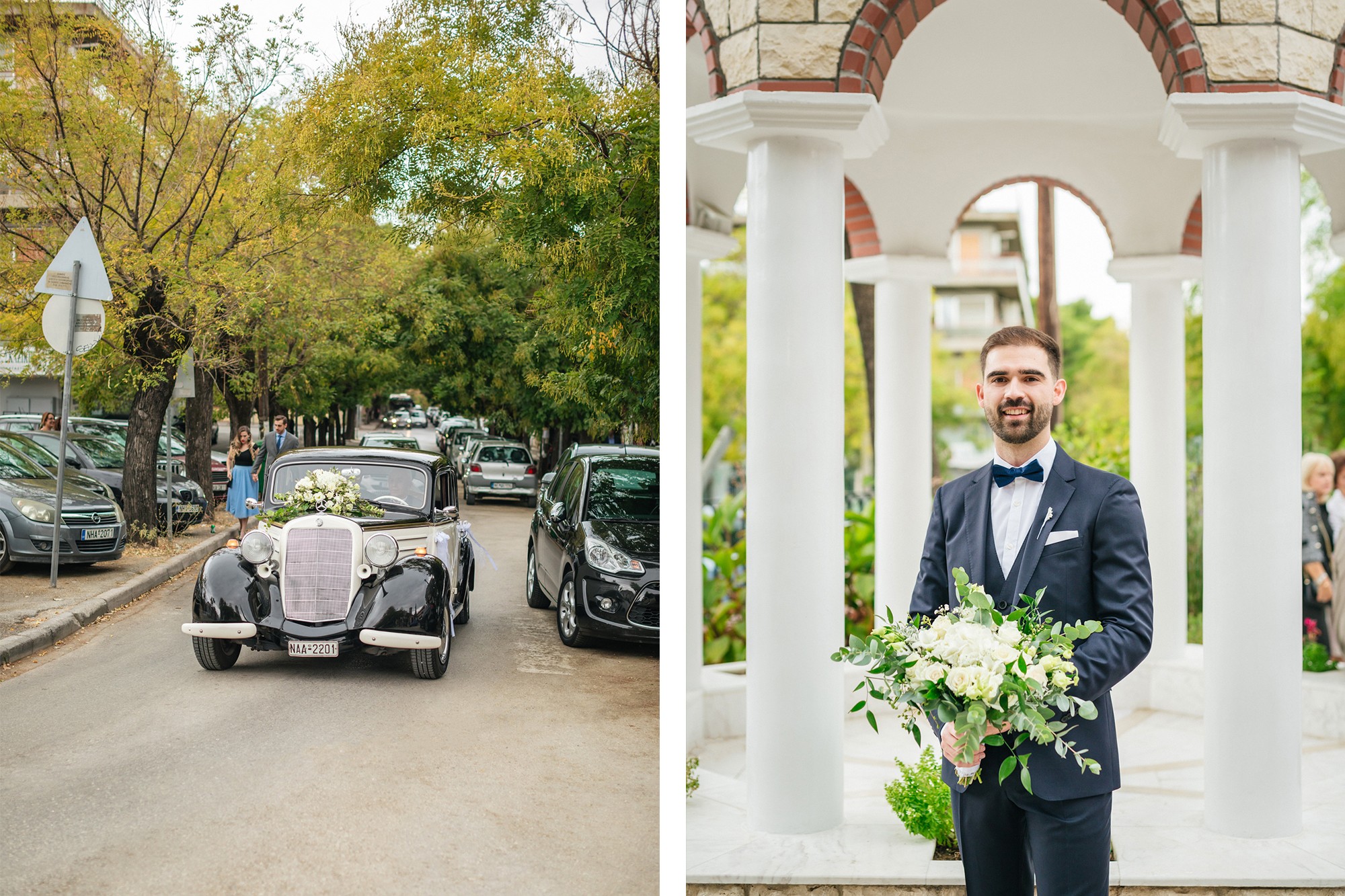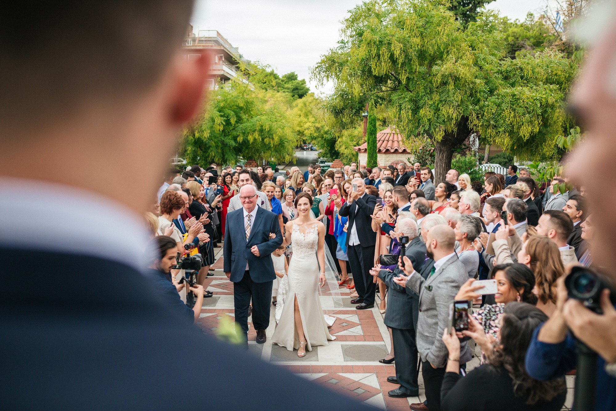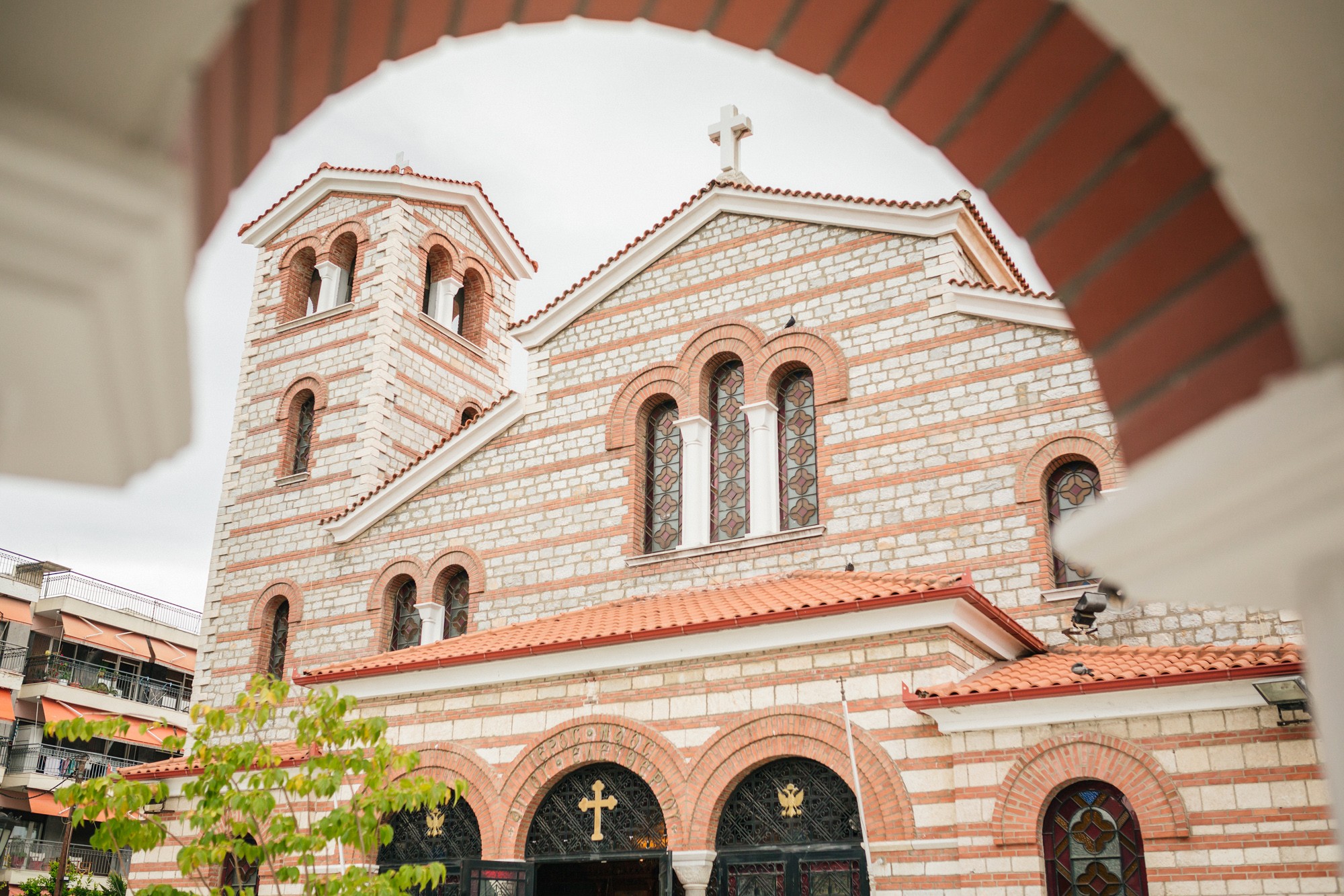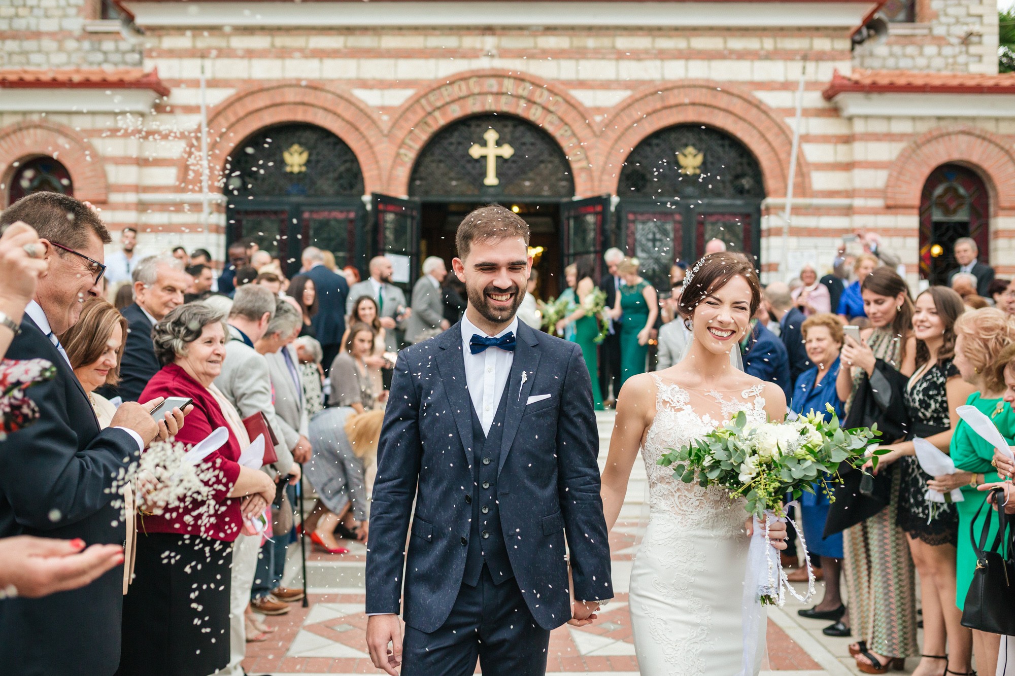 Παραδοσιακή, ζωντανή μουσική συνόδευσε τον γαμπρό στην εκκλησία. Θέαμα που ξεσήκωσε τους καλεσμένους χαρίζοντάς τους μεγάλα χαμόγελα. Οι φωτογραφίες του γάμου απέκτησαν το βαθύτερο νόημά τους με την συνάντηση του γαμπρού και της νύφης μπροστά από την πόρτα της εκκλησίας. Το μυστήριο ξεκίνησε και κύλησε με πολύ έντονο το στοιχείο του ρομαντισμού, το οποίο έγινε ακόμη εντονότερο όταν με την λήξη της τελετής, ο Μιχάλης και η Jane αντάλλαξαν όρκους ενώπιων του πάτερ και των καλεσμένων. Ήταν μια μοναδική στιγμή για τους δυο τους και αυτό φαίνεται έντονα στις φωτογραφίες του γάμου.