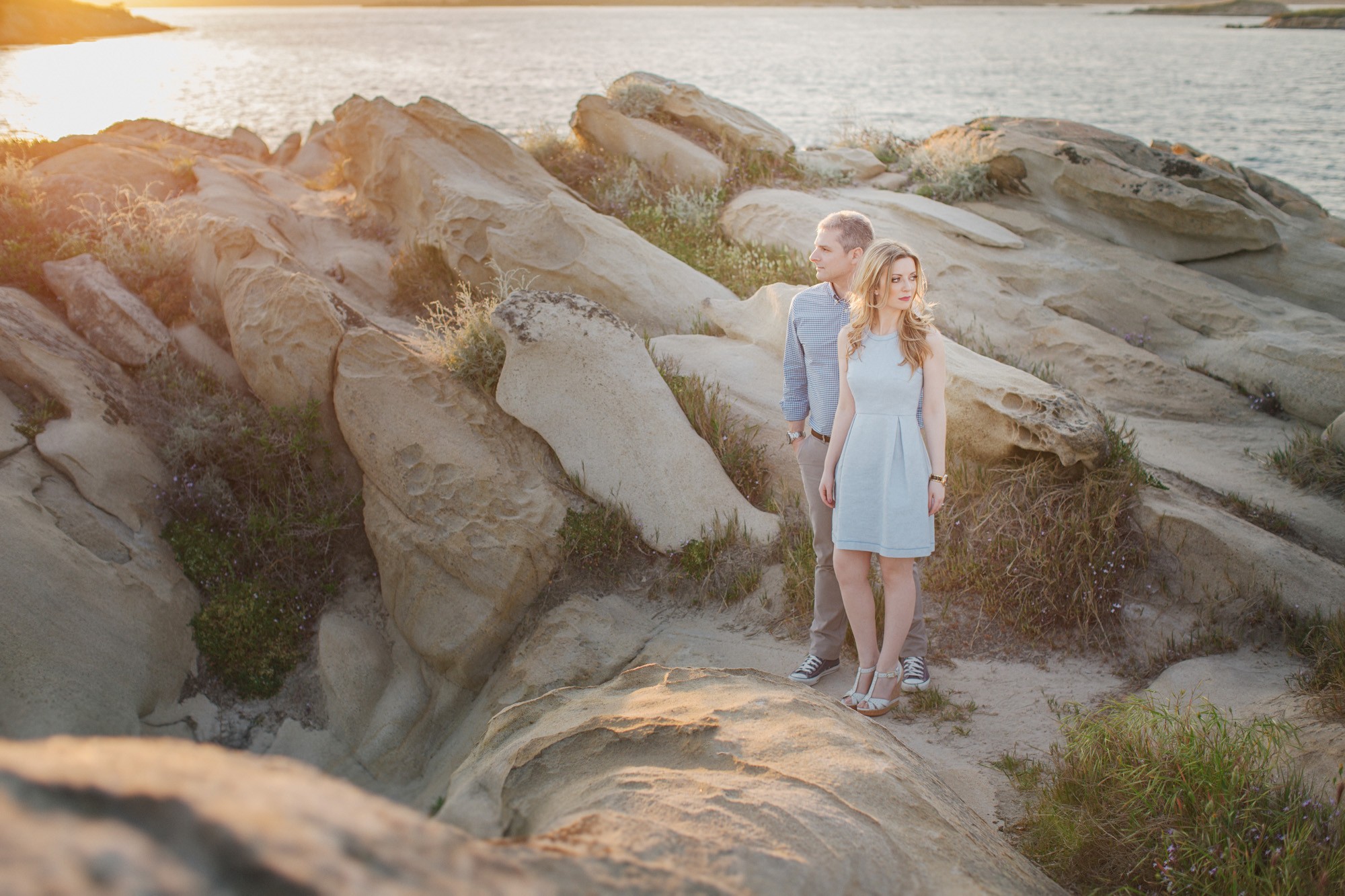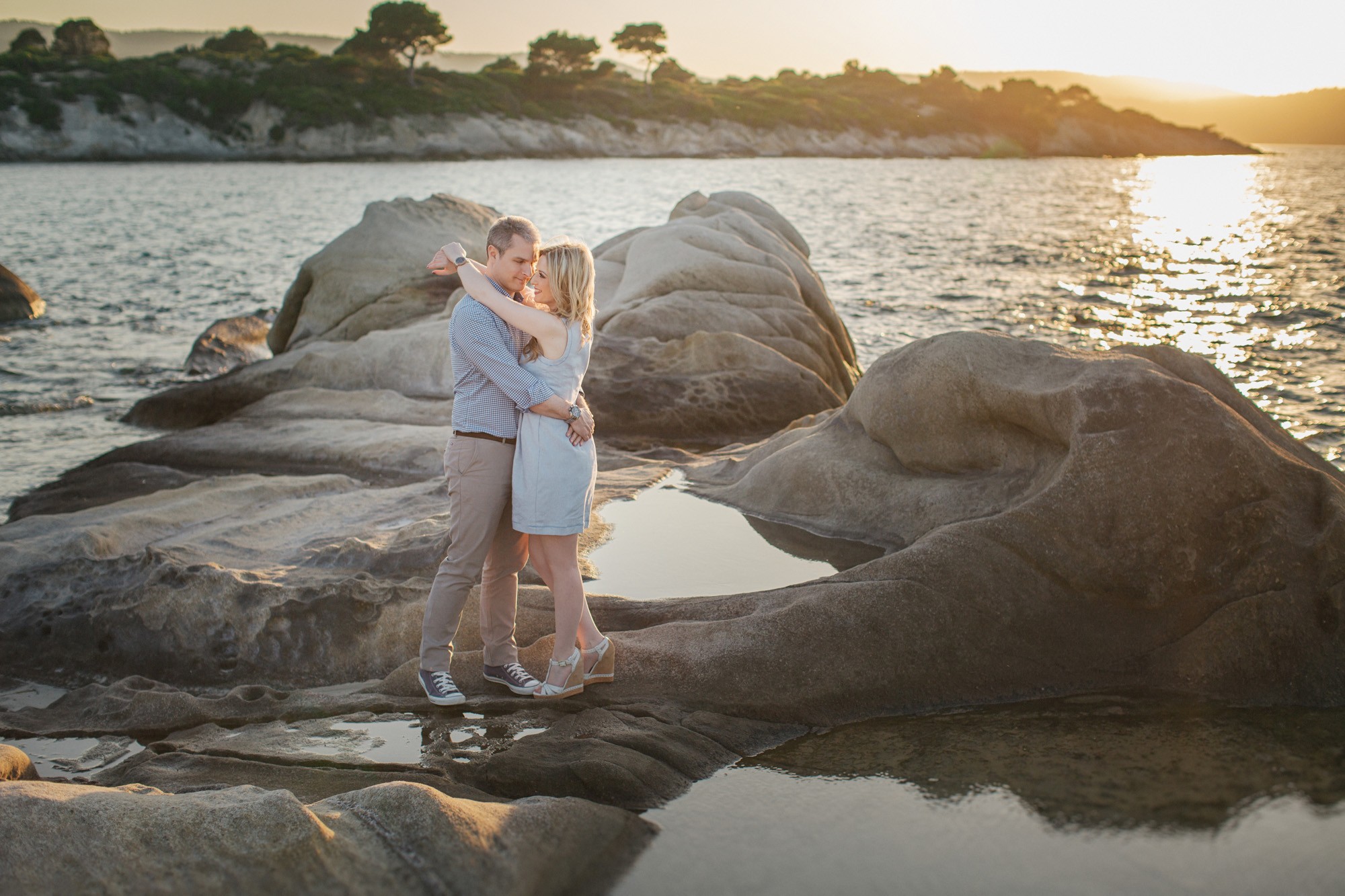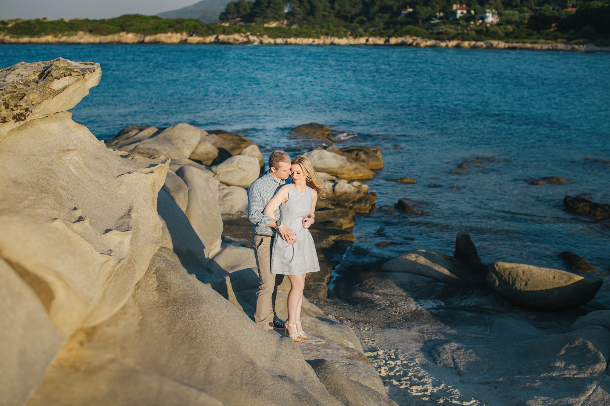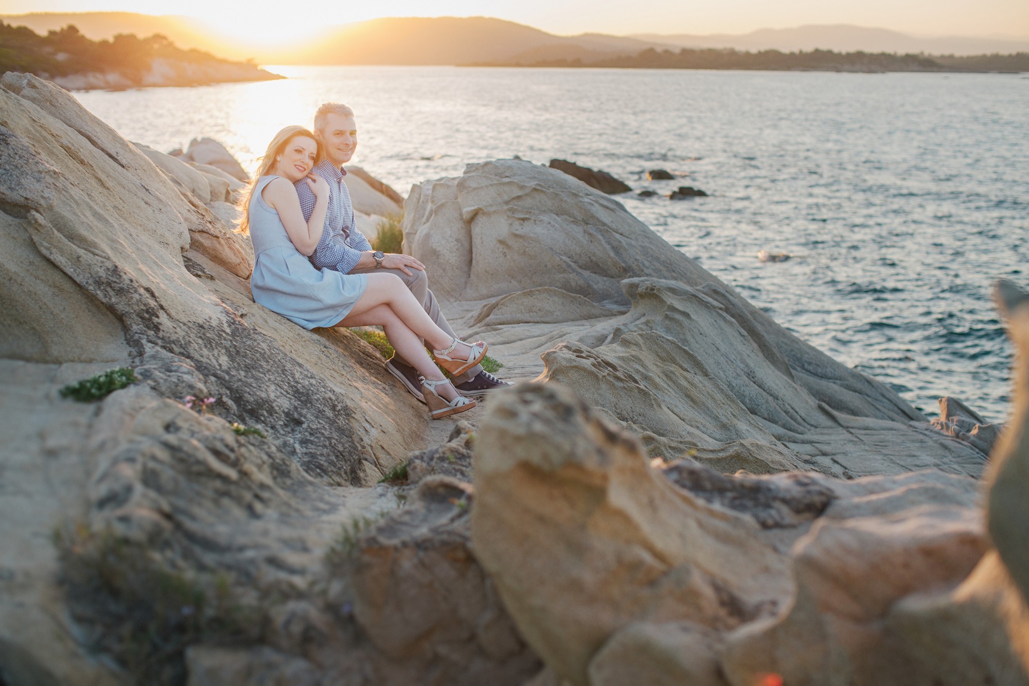 Έπειτα, κατευθυνθήκαμε προς την βραχώδη παραλία όπου τα χρώματα της δύσης του ηλίου γοήτευαν το τοπίο με τρόπο μοναδικό. Ο Νικόλαος και η Κατερίνα, νιώθοντας πλέον οικεία μπροστά στον φακό κατάφεραν να ξεδιπλώσουν τον πιο ελκυστικό εαυτό τους εμπνέοντάς μας για μια εξέχουσα φωτογράφιση η οποία κόσμησε το Ευχολόγιό τους το οποίο κίνησε των θαυμασμό των αγαπημένων τους προσώπων την ημέρα του γάμου τους.