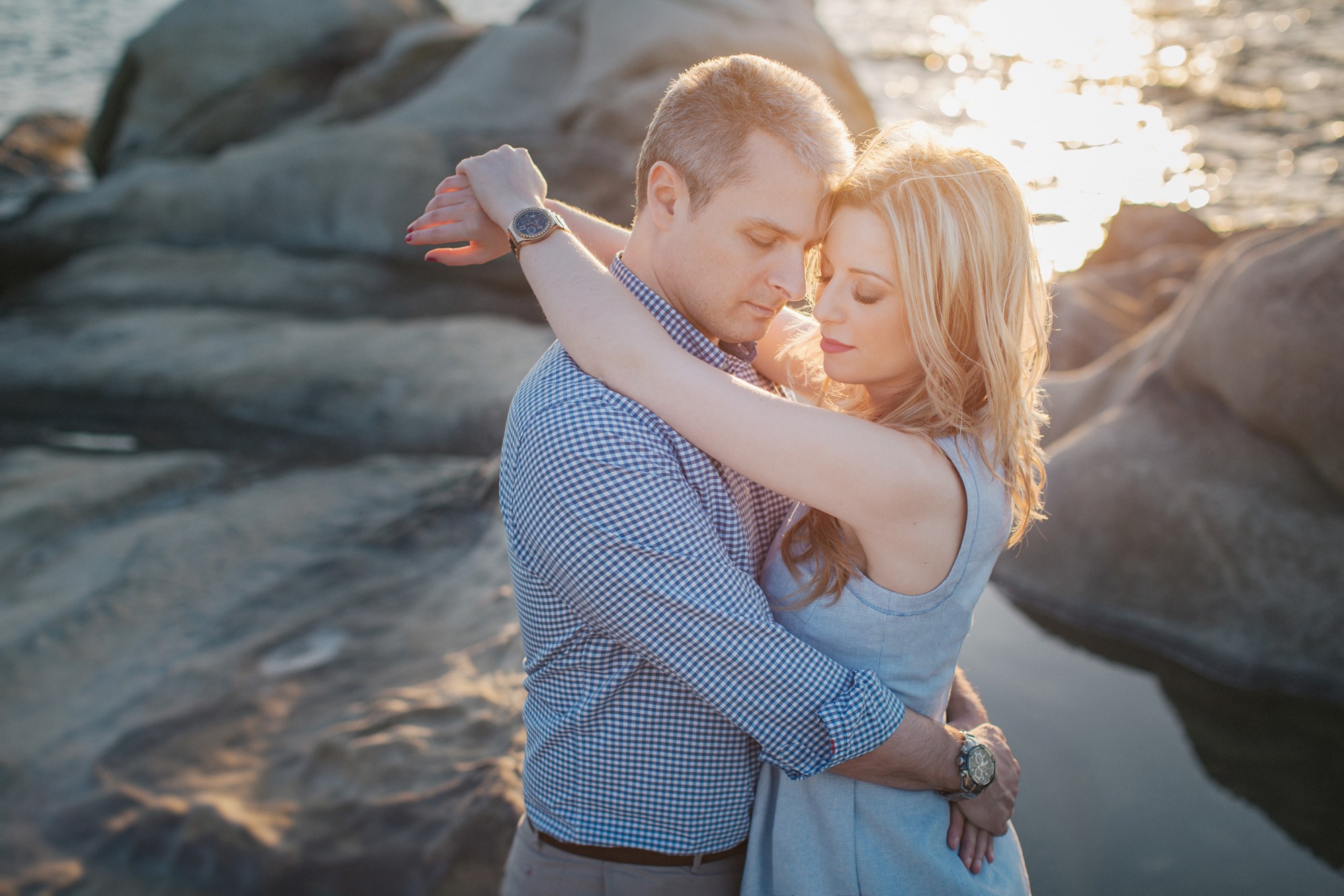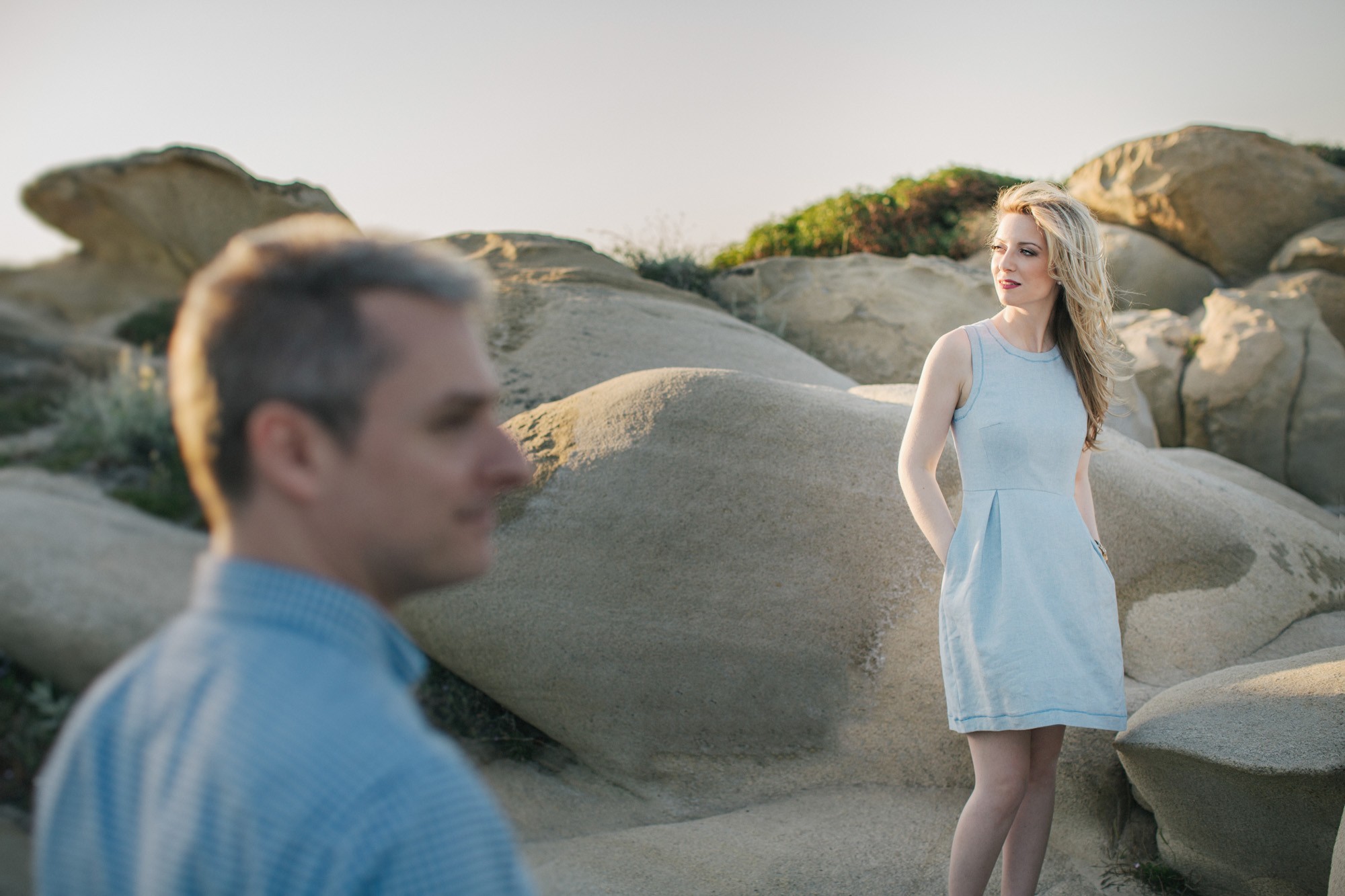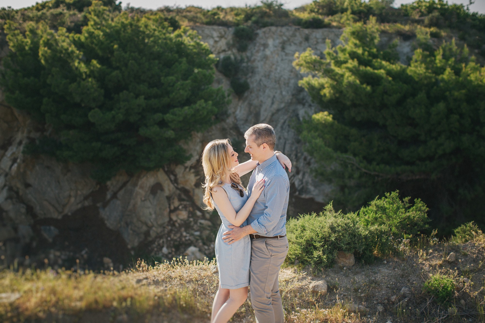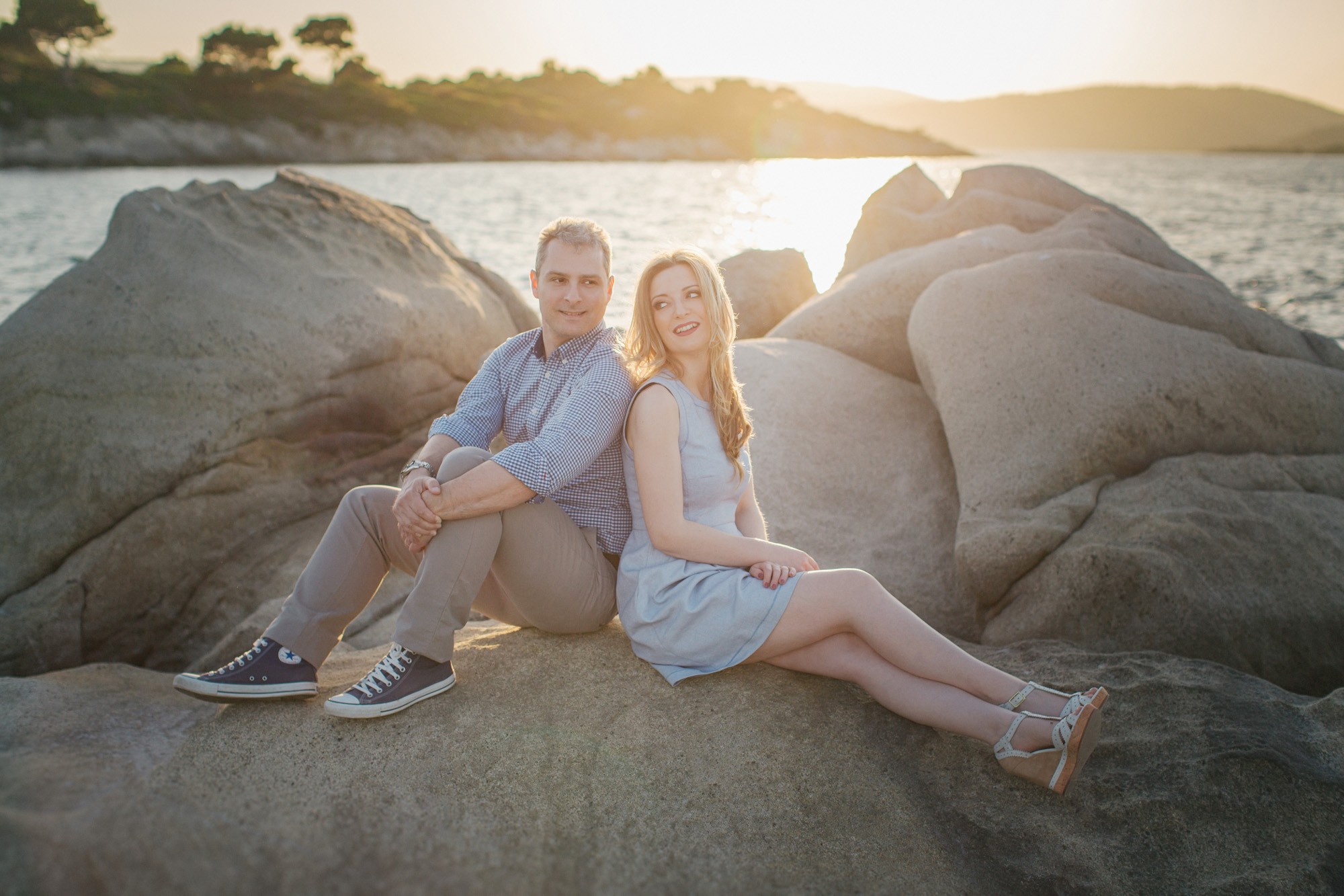 Έπειτα, κατευθυνθήκαμε προς την βραχώδη παραλία όπου τα χρώματα της δύσης του ηλίου γοήτευαν το τοπίο με τρόπο μοναδικό. Ο Νικόλαος και η Κατερίνα, νιώθοντας πλέον οικεία μπροστά στον φακό κατάφεραν να ξεδιπλώσουν τον πιο ελκυστικό εαυτό τους εμπνέοντάς μας για μια εξέχουσα φωτογράφιση η οποία κόσμησε το Ευχολόγιό τους το οποίο κίνησε των θαυμασμό των αγαπημένων τους προσώπων την ημέρα του γάμου τους.