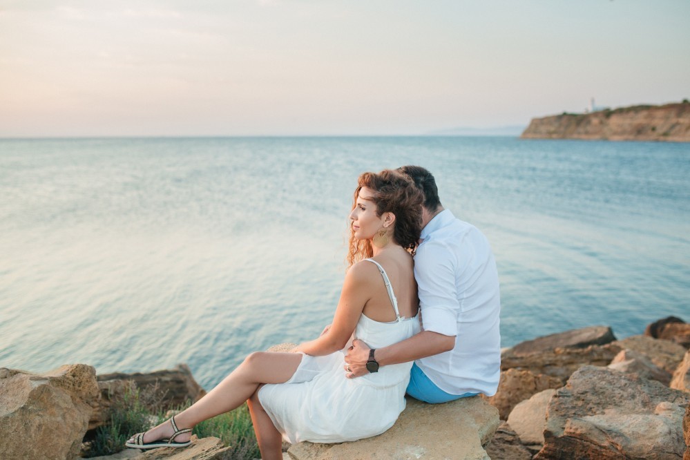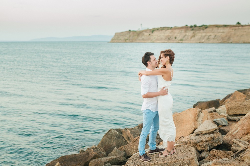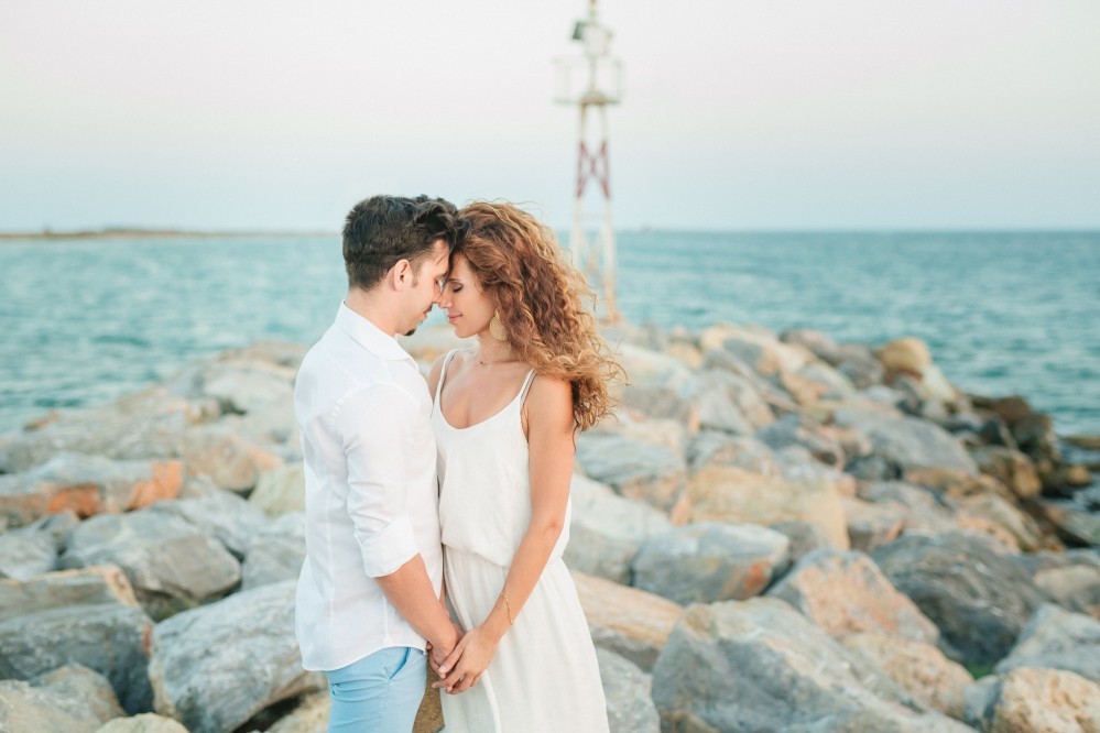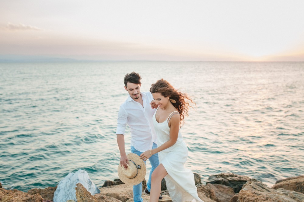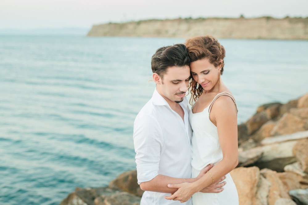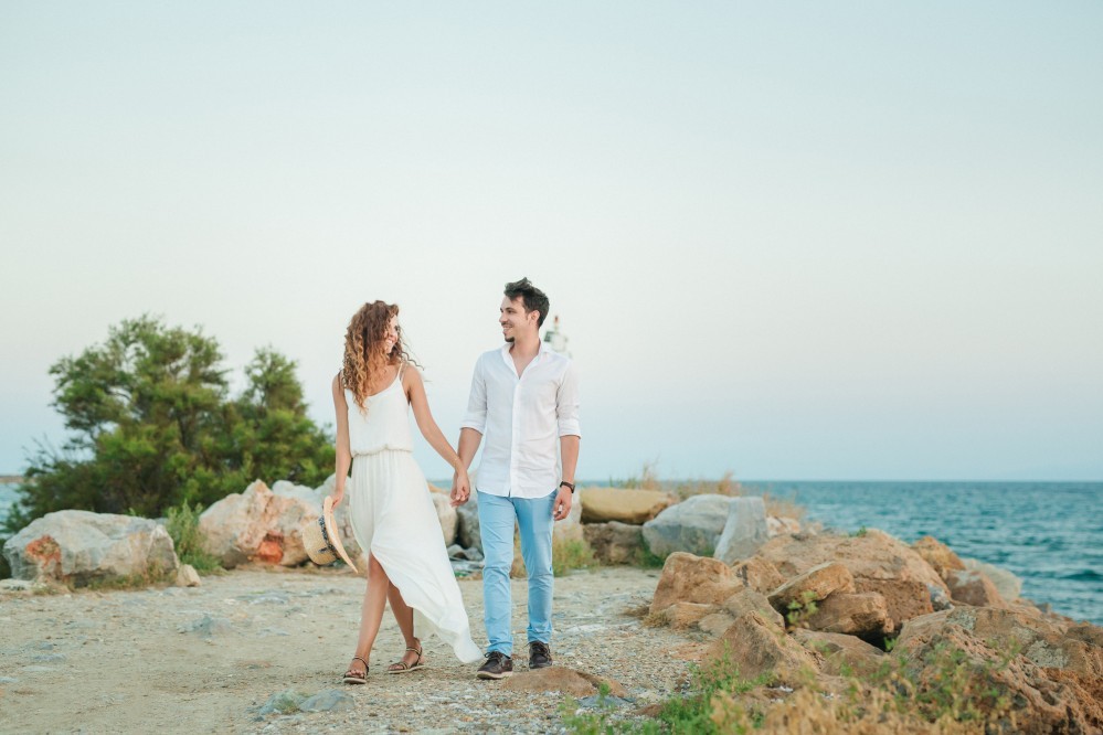Dimitris and Voula have such a strong bond between them that is very difficult to describe. Through their photography, however, we can get a taste of their love. They are enjoying our walk by the sea, hugging each other, glowing and being happy together. Voula looks ethereal in her white, airy dress, and Dimitris, her future husband, is charming. They are both very beautiful people who become even more beautiful when next to each other.