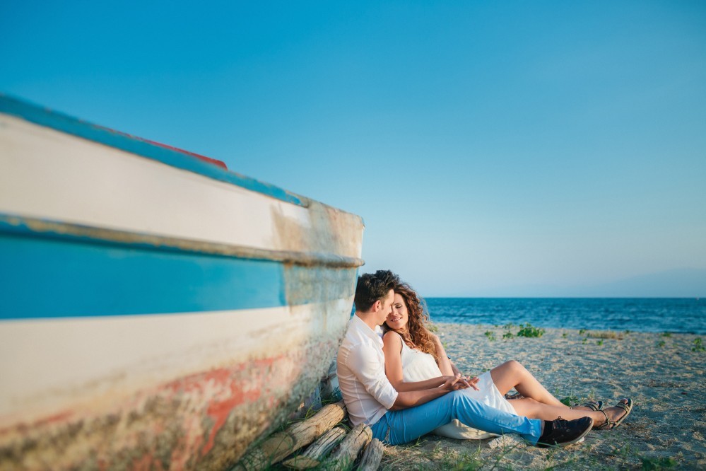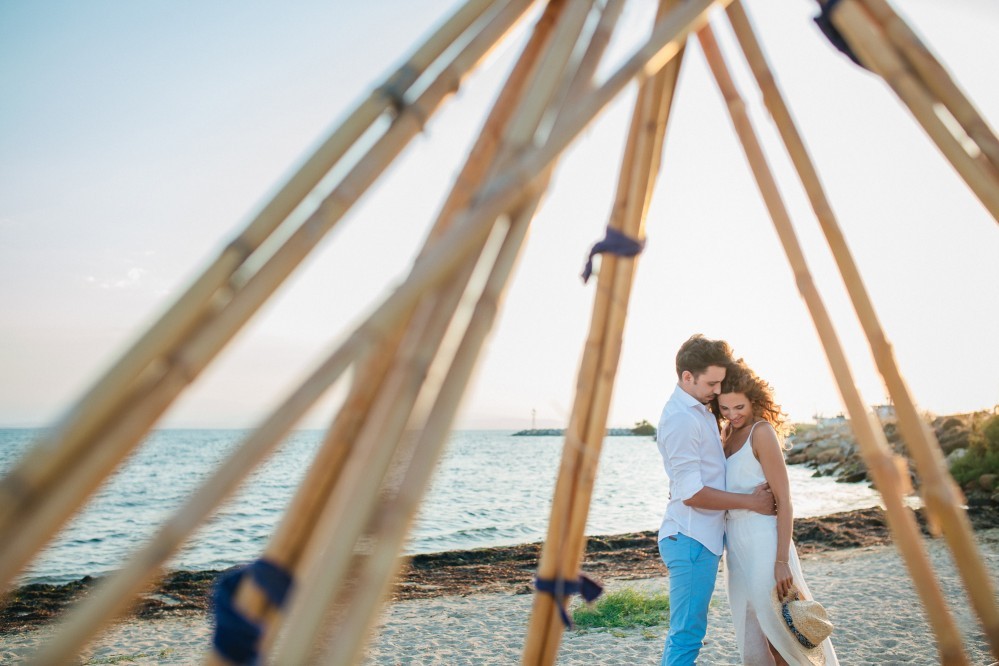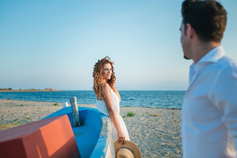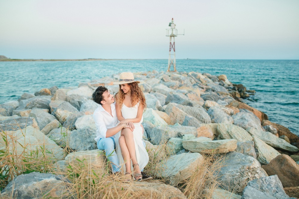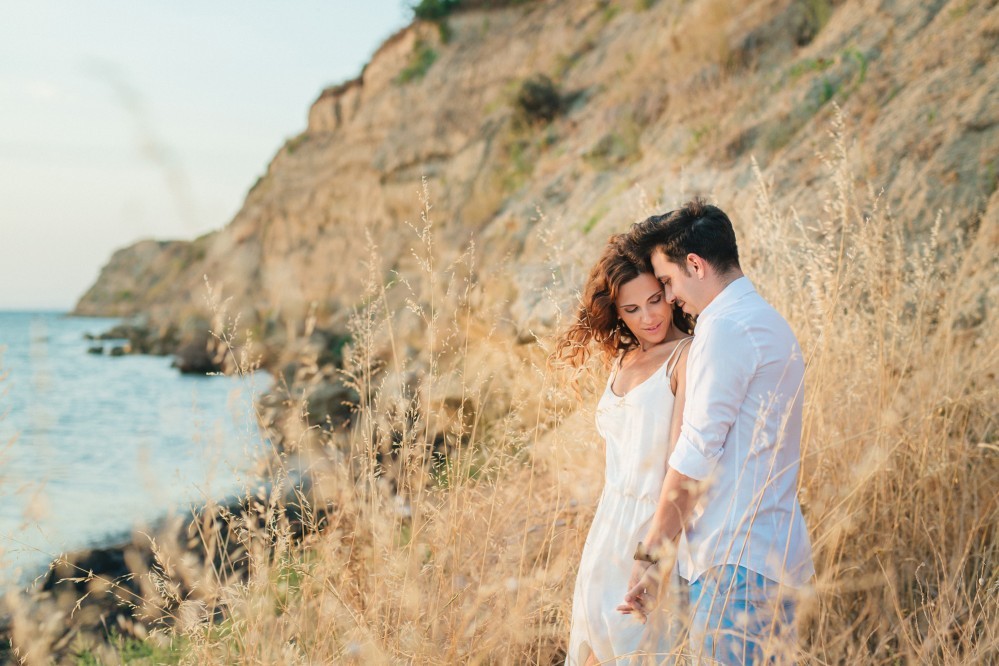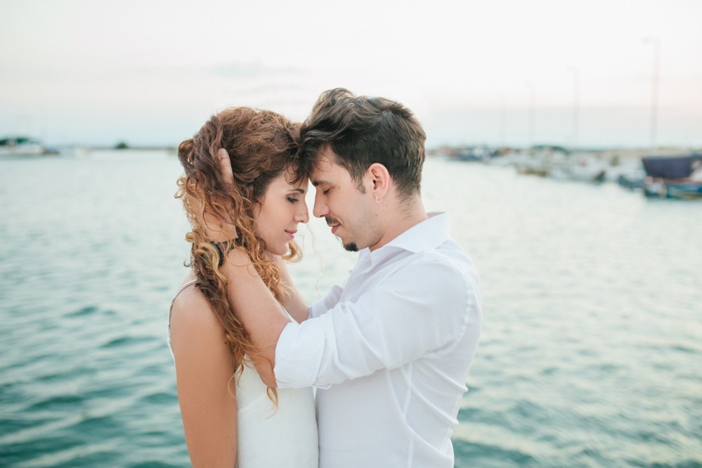 Dimitris and Voula have such a strong bond between them that is very difficult to describe. Through their photography, however, we can get a taste of their love. They are enjoying our walk by the sea, hugging each other, glowing and being happy together. Voula looks ethereal in her white, airy dress, and Dimitris, her future husband, is charming. They are both very beautiful people who become even more beautiful when next to each other.