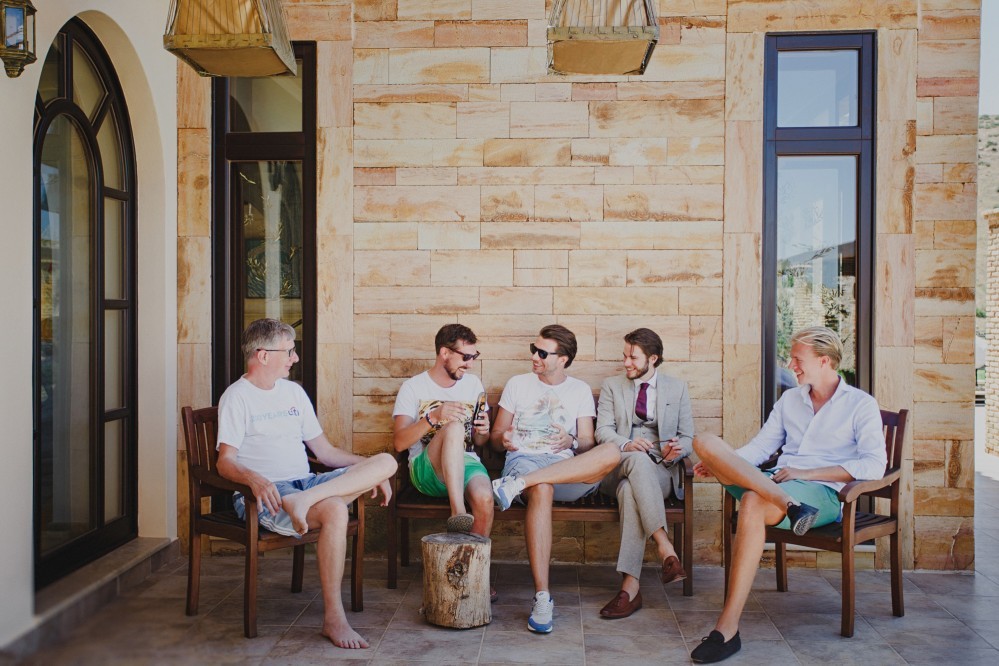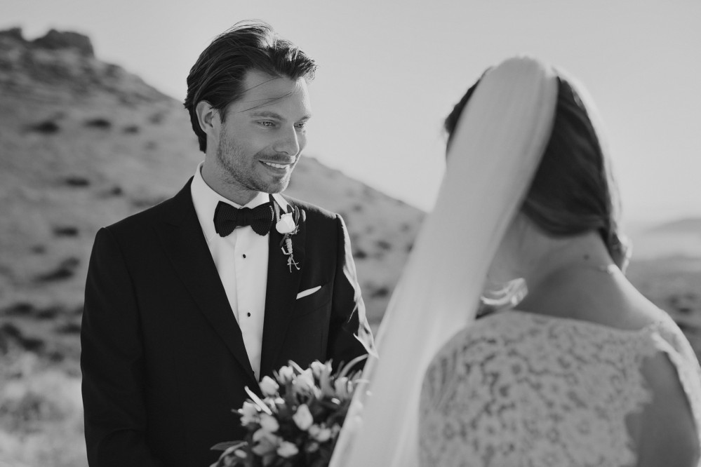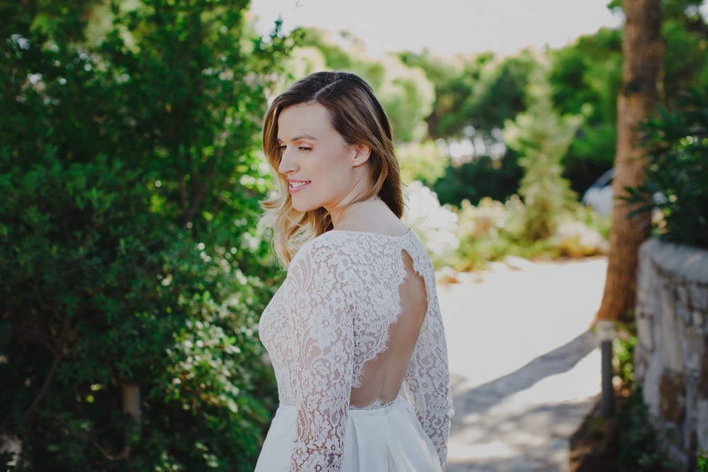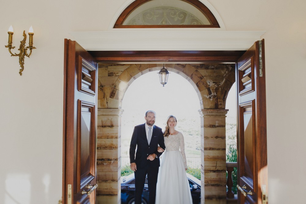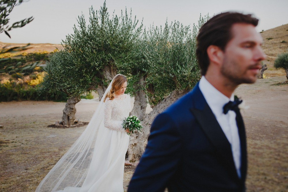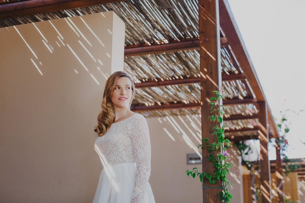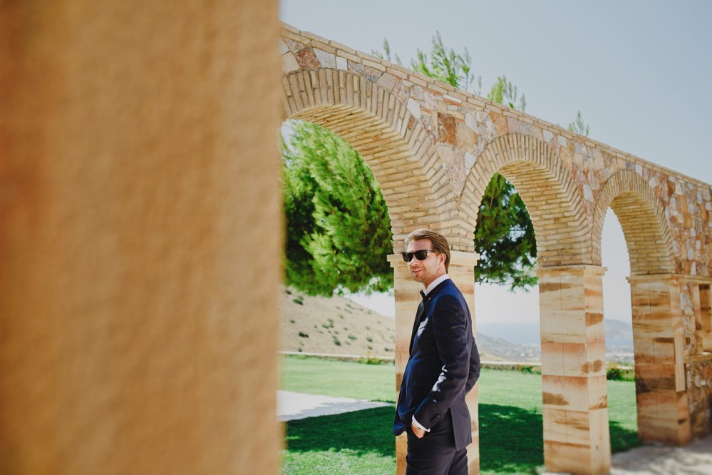 Mary chose a French style gown, designed by Rime Arodaky. The style of the dress masterfully combined the finesse of French lace with a rock-n-roll feel and suited her beautifully. Her bridal bouquet consisted of olive twigs and white mini roses. Jan Wicher in his blue linen suit couldn’t have been a better match- the two of them made a gorgeous couple. Our team used the terracotta and gold background to take pictures and portraits, oozing with elegance and Greek summer spirit.