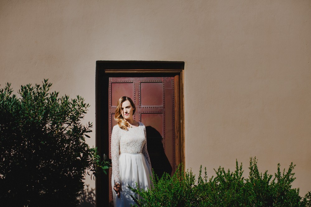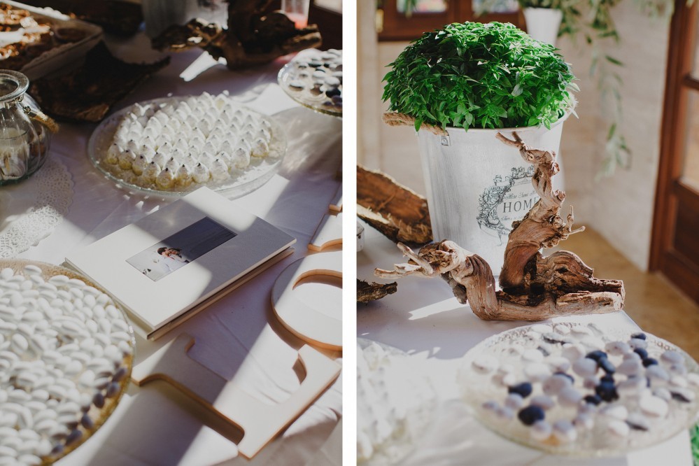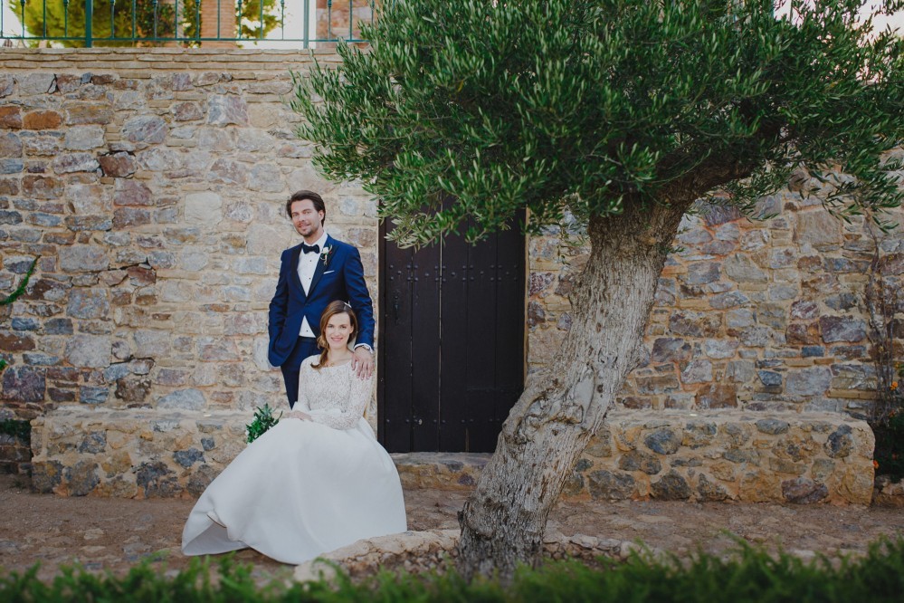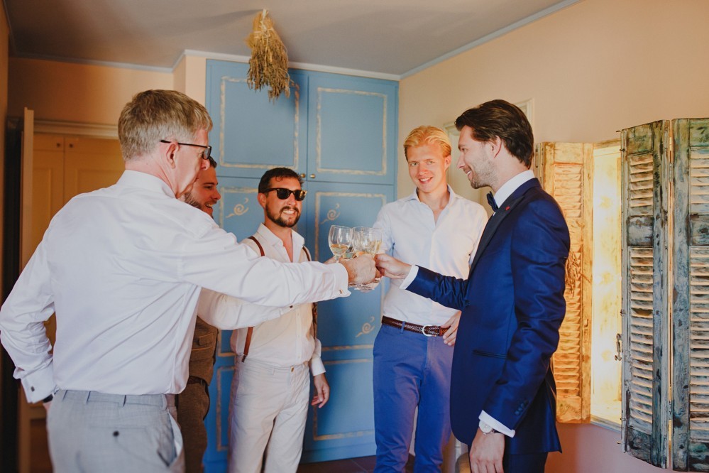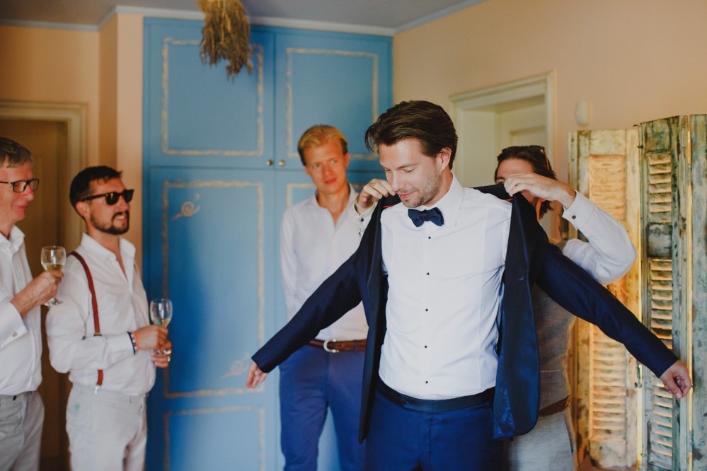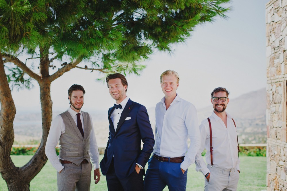 Mary chose a French style gown, designed by Rime Arodaky. The style of the dress masterfully combined the finesse of French lace with a rock-n-roll feel and suited her beautifully. Her bridal bouquet consisted of olive twigs and white mini roses. Jan Wicher in his blue linen suit couldn’t have been a better match- the two of them made a gorgeous couple. Our team used the terracotta and gold background to take pictures and portraits, oozing with elegance and Greek summer spirit.