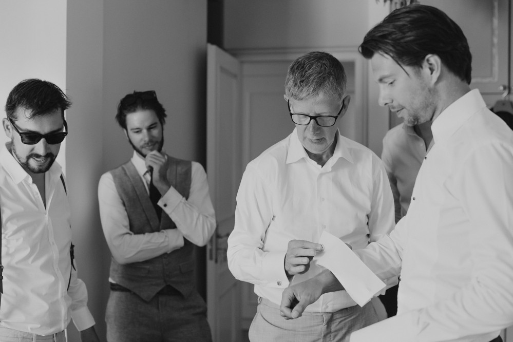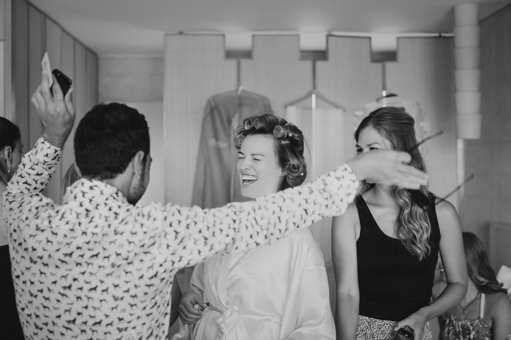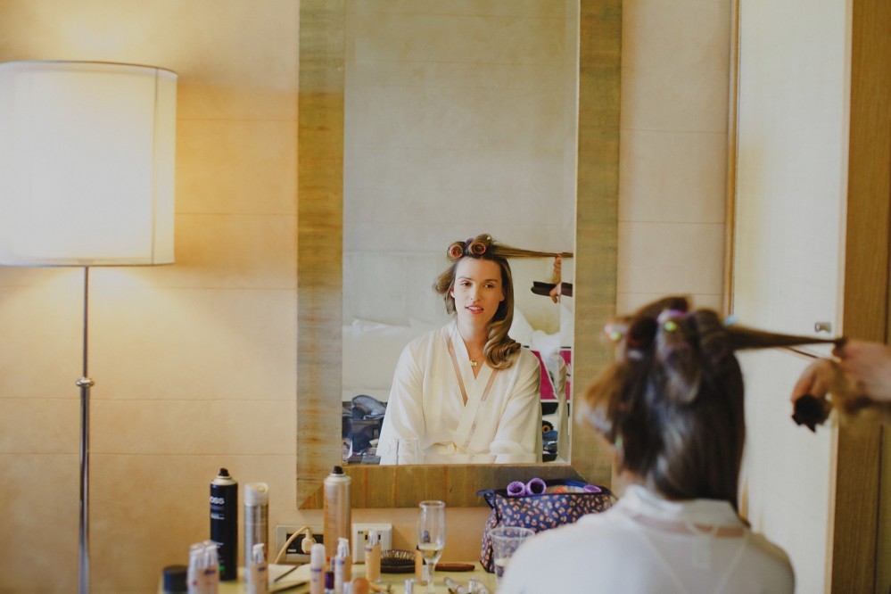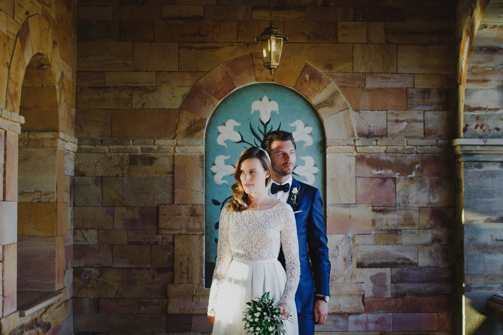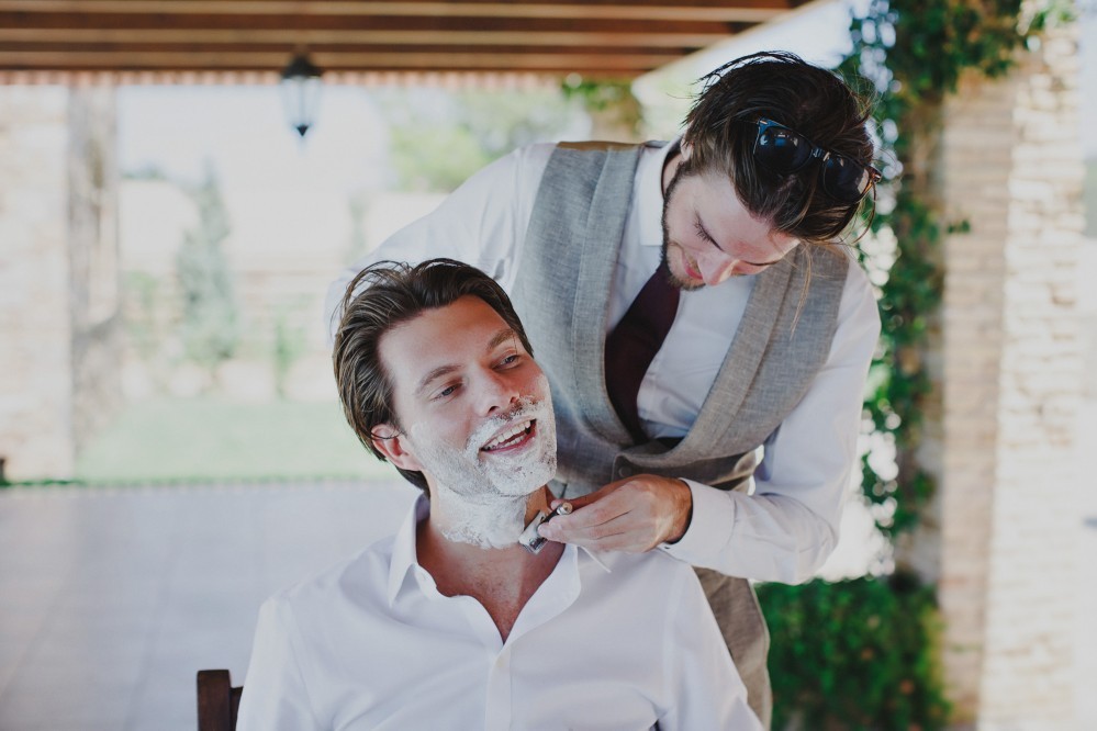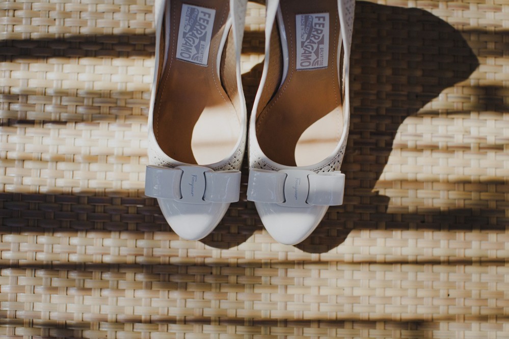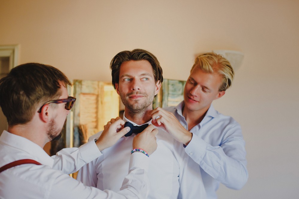 Mary chose a French style gown, designed by Rime Arodaky. The style of the dress masterfully combined the finesse of French lace with a rock-n-roll feel and suited her beautifully. Her bridal bouquet consisted of olive twigs and white mini roses. Jan Wicher in his blue linen suit couldn’t have been a better match- the two of them made a gorgeous couple. Our team used the terracotta and gold background to take pictures and portraits, oozing with elegance and Greek summer spirit.