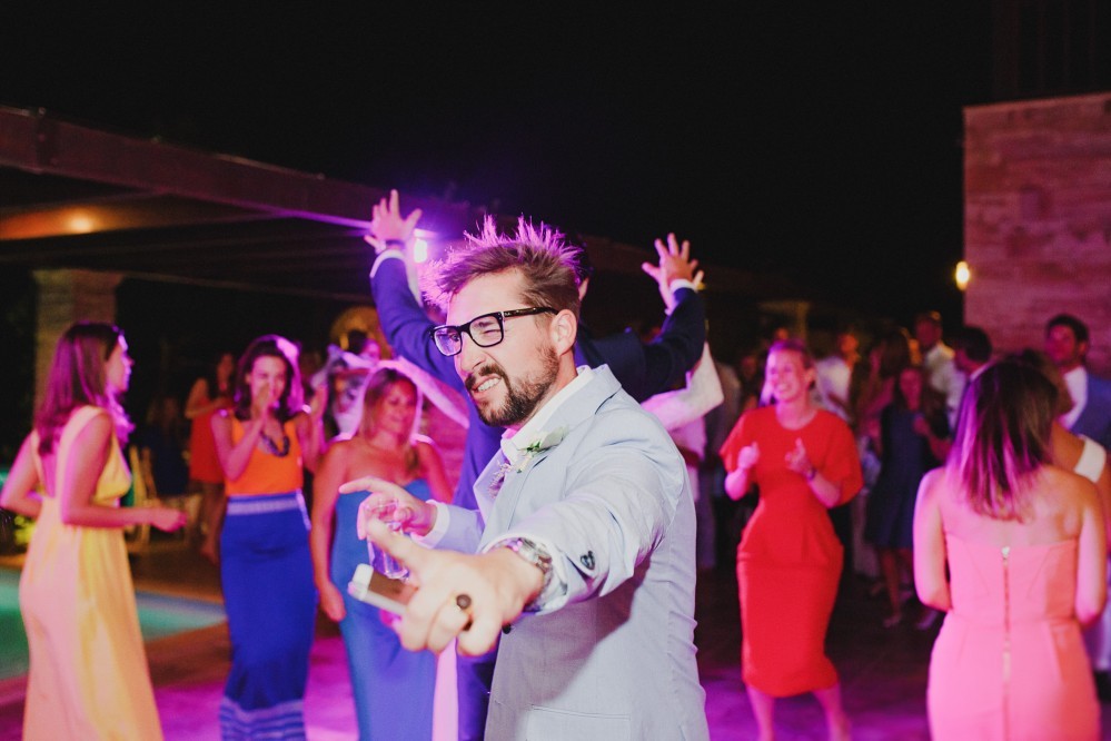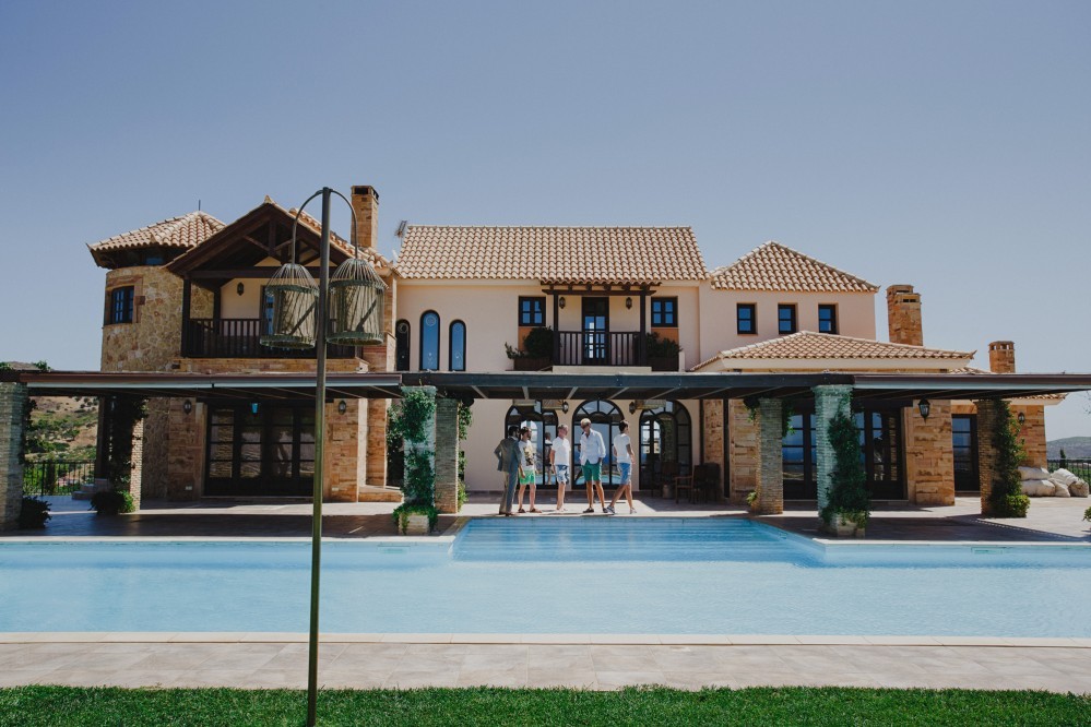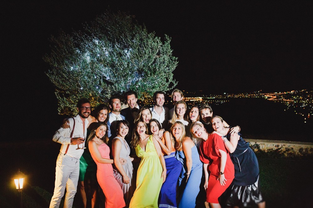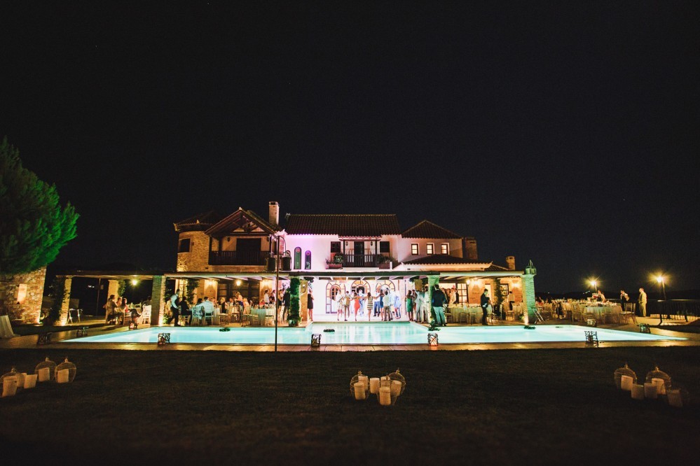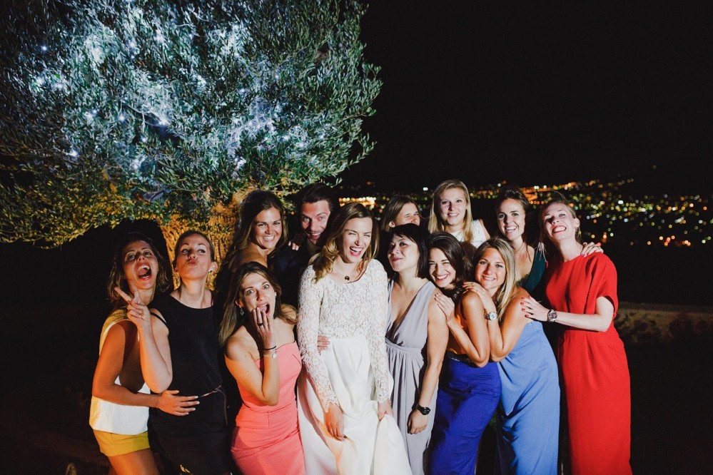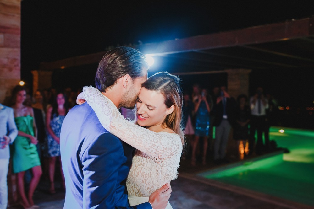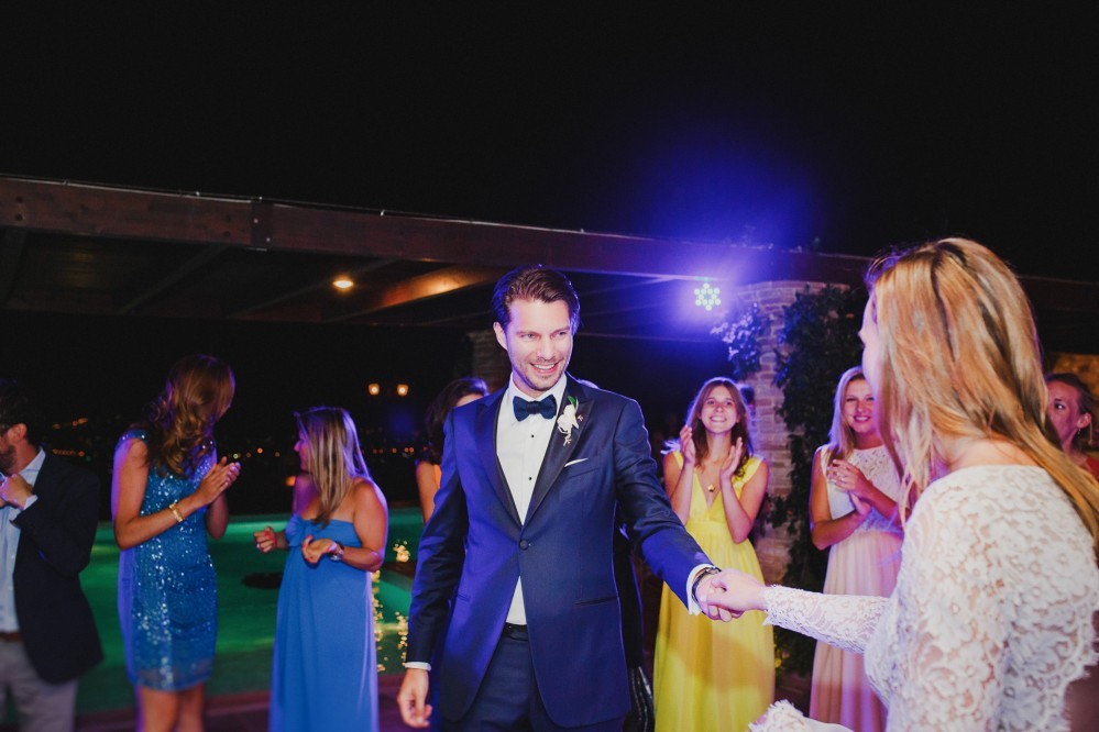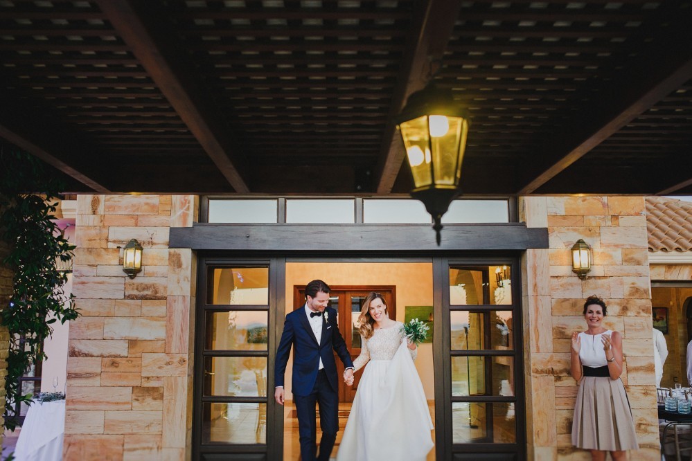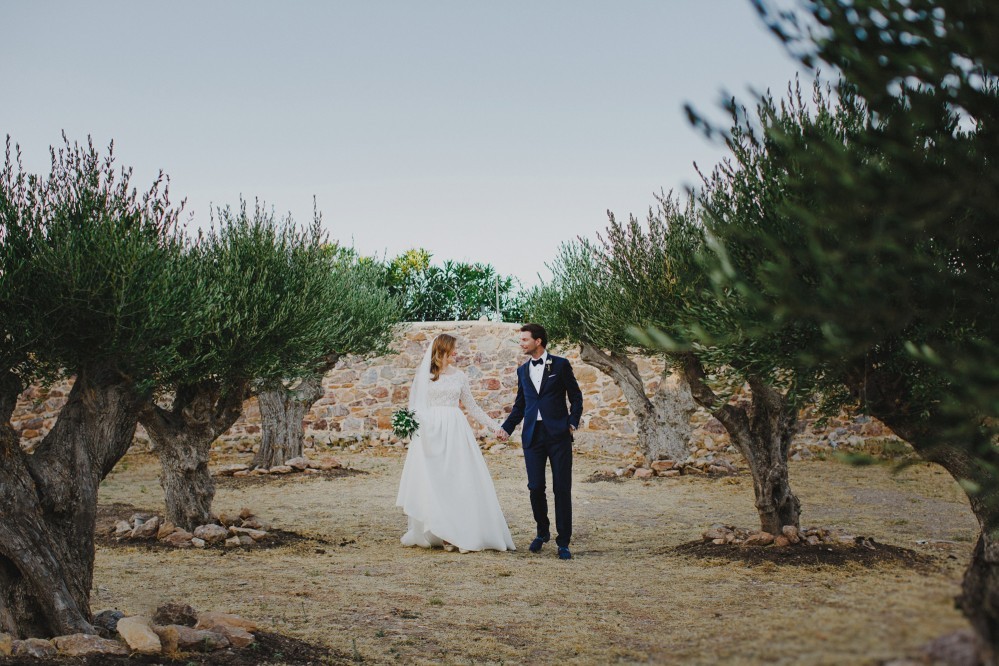 The wedding was designed by Mya Wedding and planner Helena Paleologou, who made sure to enrich the natural beauty of the summer setting with carefully selected decoration. The couple, both wine lovers, personally chose the wine list and requested this element to be woven in the fabric of the wedding theme. Baby breath, white roses, olive branches were combined with vine leaves and green grapes to bring this to life.